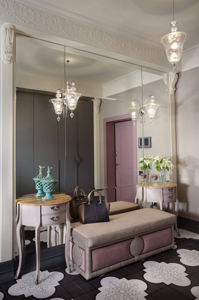 Les concepteurs proposent de nombreuses idées différentes. L'installation d'une armoire en miroir vous permet d'économiser de l'espace. Une combinaison intéressante de divers éléments décoratifs et de sculptures en stuc. Les bordures avec lampes créent une impression de chaleur et de confort.