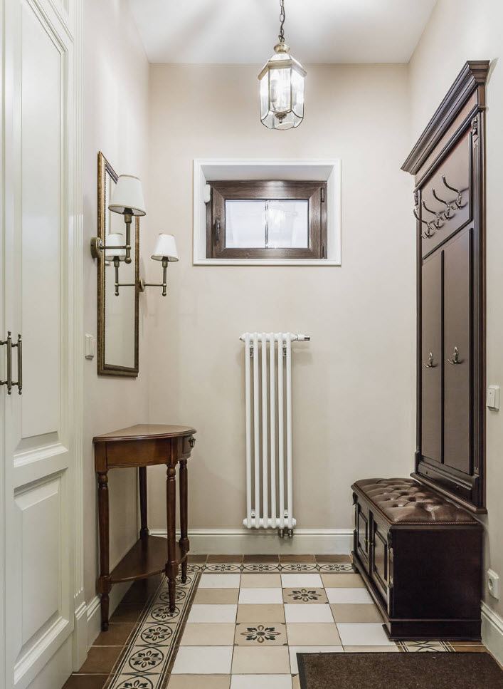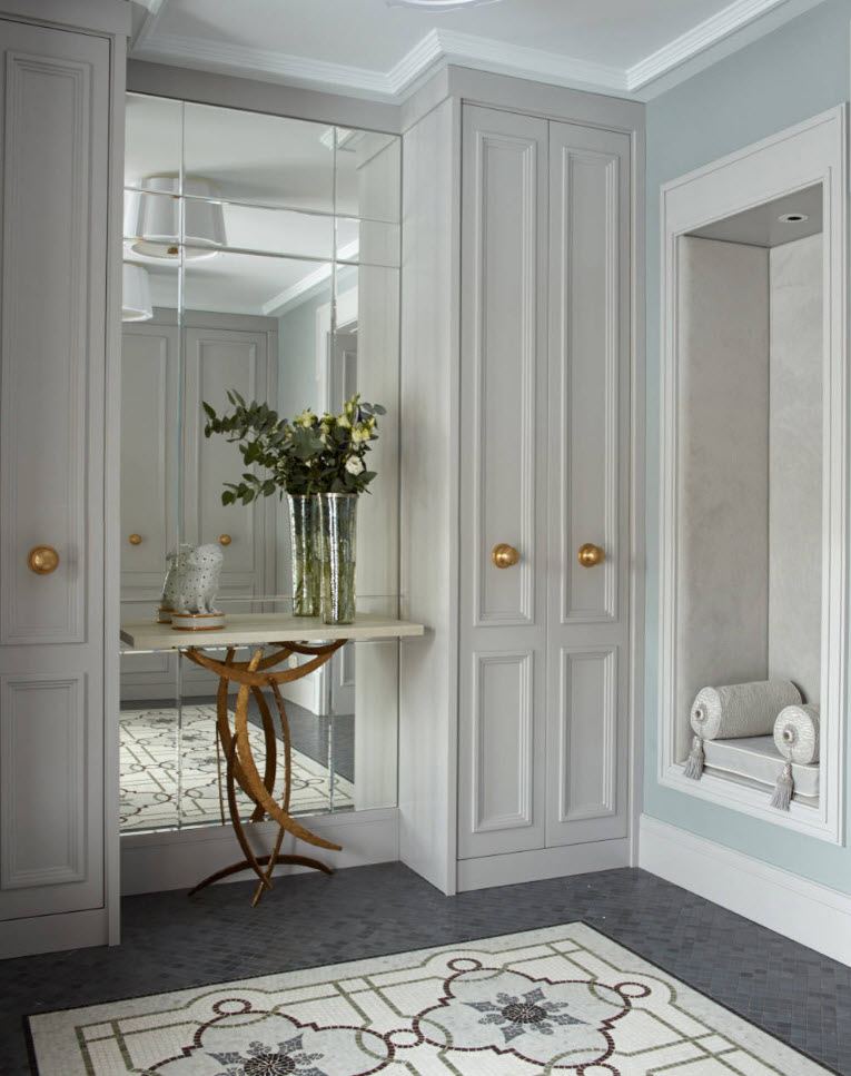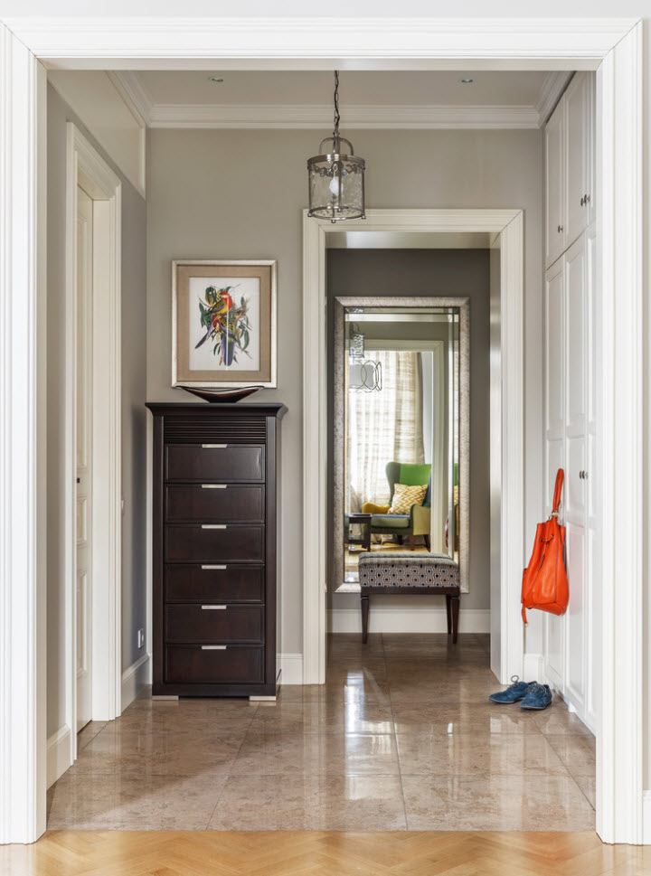 Pour créer un couloir dans le style classique, vous devez répartir rationnellement l'espace. Les meubles et accessoires sont recommandés pour être encastrés dans les murs. Cela vous permettra de stocker tous les articles en un seul endroit.