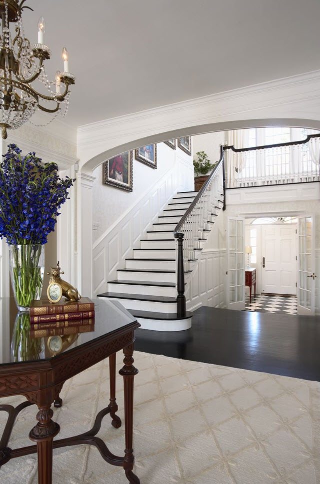Dans les grandes maisons privées dans les couloirs ont souvent des escaliers. Avec leur aide, vous pouvez également vous concentrer sur les détails. Pour cela, diverses boucles, sculptures et autres décorations sont utilisées. Vous pouvez voir beaucoup de photos de la conception du couloir de la maison dans le style du classique.
