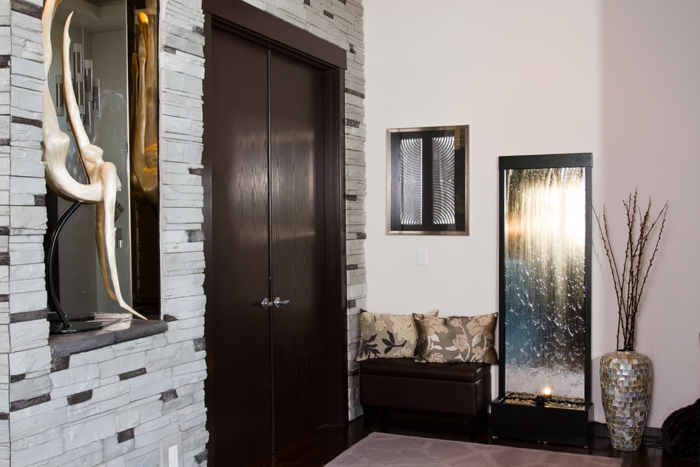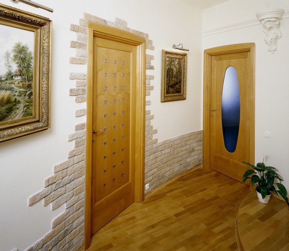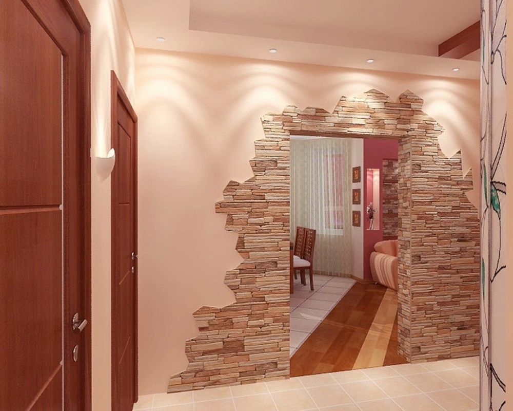 Une option très courante est la décoration de l'espace près des portes. De plus, sous la pierre, vous pouvez disposer une partie du mur comme élément décoratif. Dans ce cas, il serait bien de placer des étagères sur le mur, ou de mettre en évidence un «fragment de pierre» à l'aide d'un dessin ou d'une application, soulignant le caractère unique de la solution intérieure.