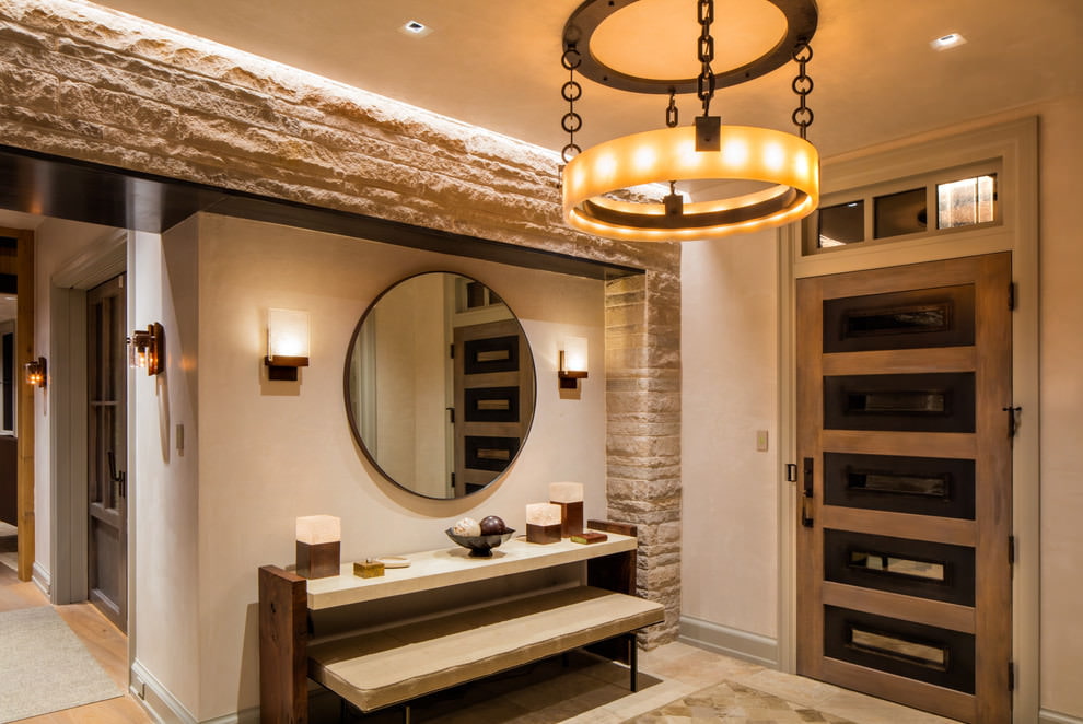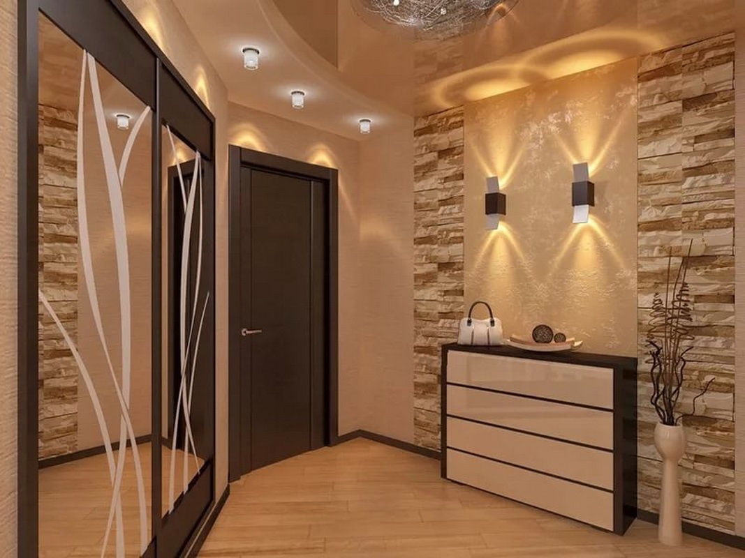 En choisissant des garnitures en pierre pour le couloir, vous devez faire attention à l'emplacement des lampes. Un lustre classique au plafond n'est pas l'option la plus appropriée, mais l'éclairage au mur rendra la pièce spectaculaire et confortable.