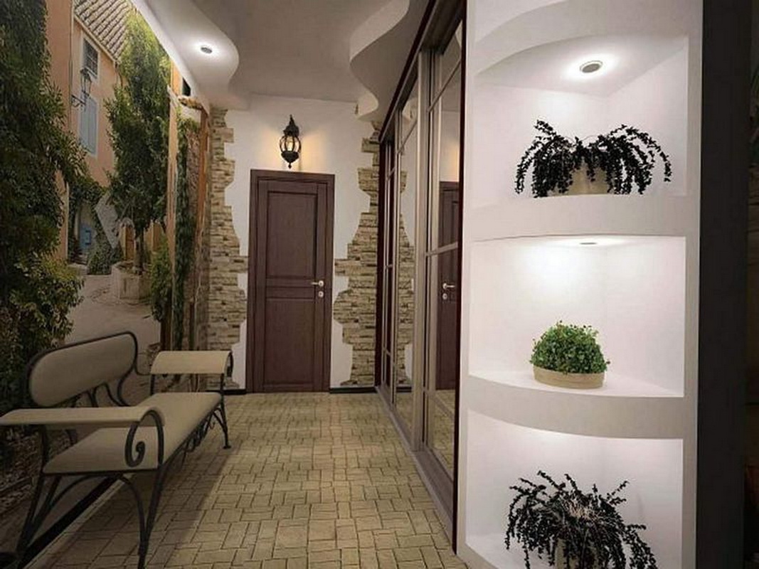 Afin de compléter la composition dans le couloir, il doit être décoré avec divers accessoires, miroirs et plantes.