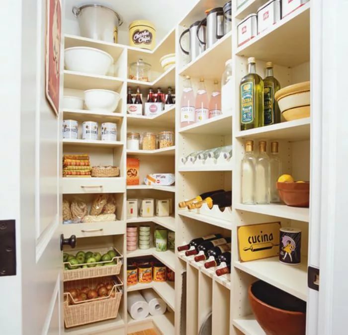 Au fait, c'est le vrai but du garde-manger. Même sous le tsar Gorokh, des recoins spéciaux étaient réservés dans les maisons pour le stockage à long terme de la nourriture. Un acte de transformation similaire devrait être considéré comme un retour aux traditions russes. Étant donné que les cuisines des vieilles maisons sont petites, le réaménagement supprimera la plupart des ustensiles de cuisine. L'espace libre peut être utilisé pour un design élégant.