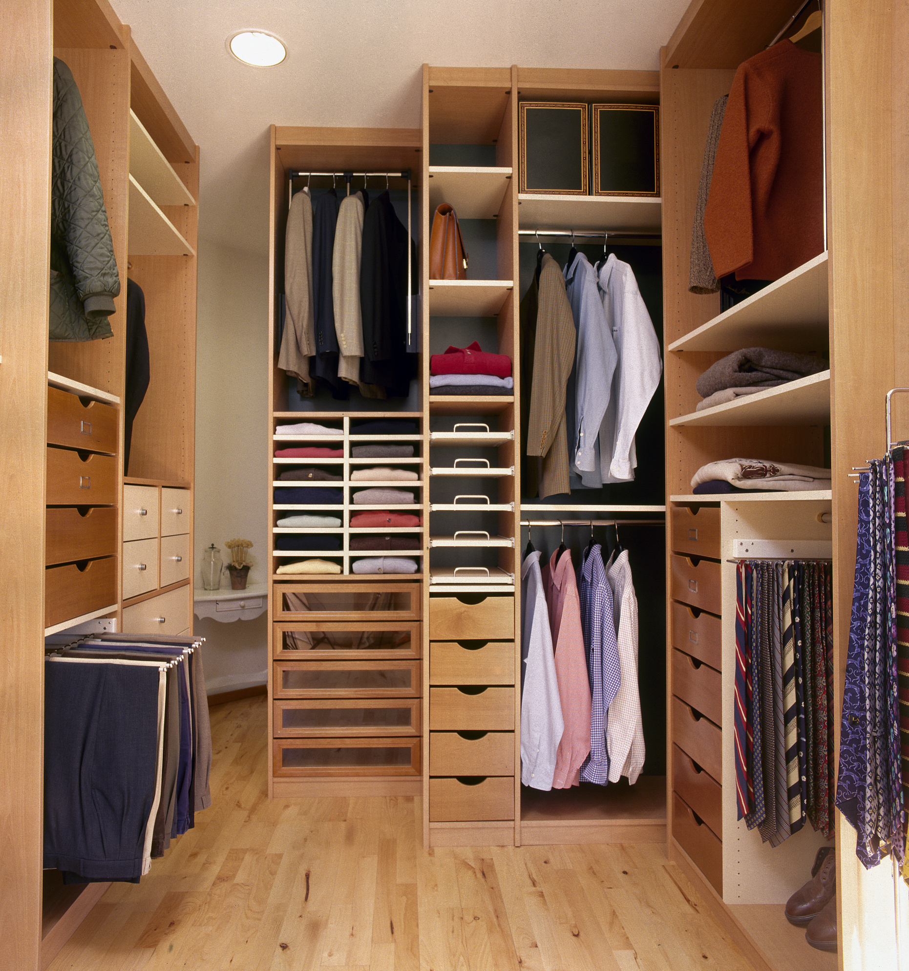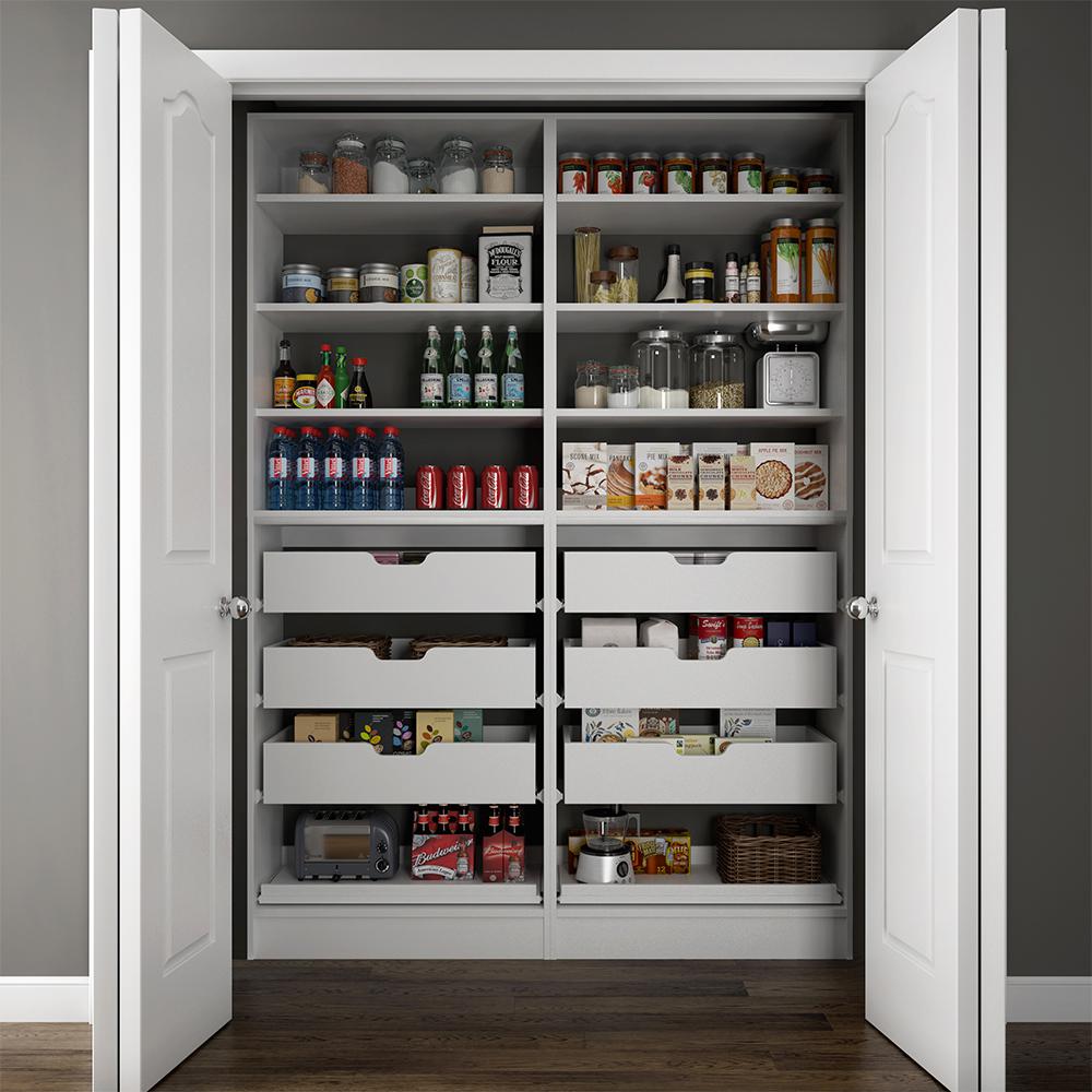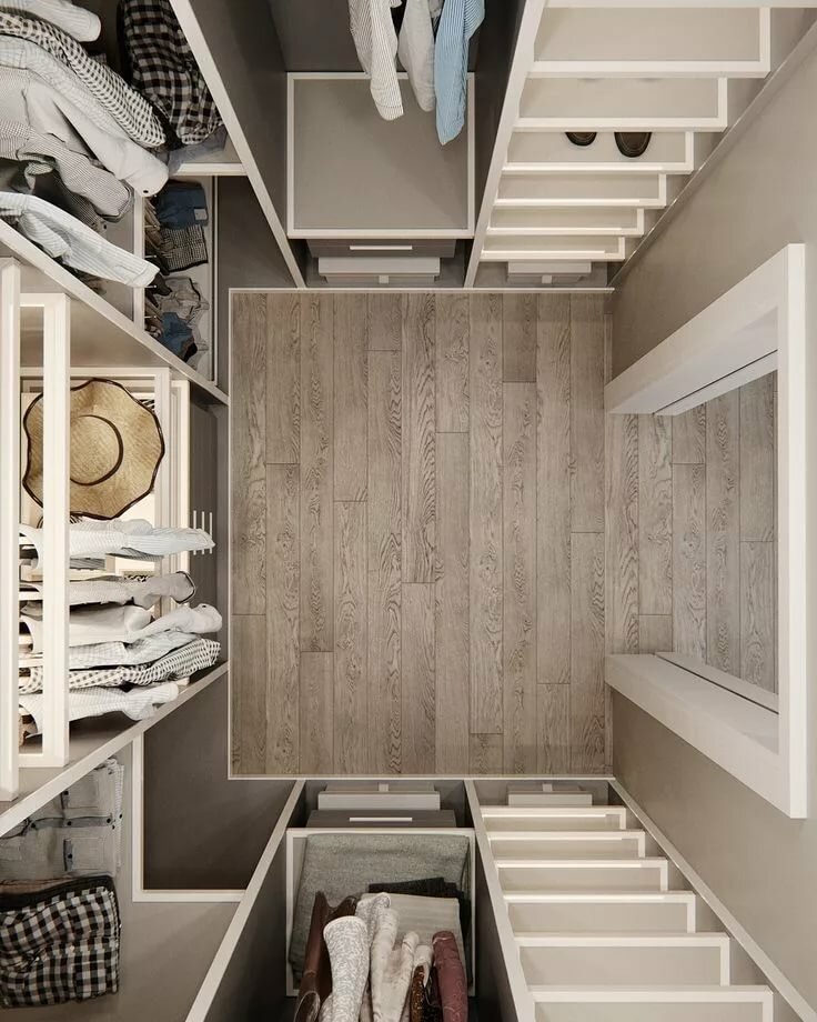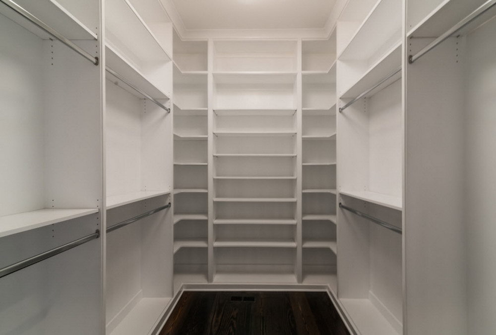 Le garde-manger dans le dressing peut être organisé par deux armoires opposées avec des étagères ouvertes.