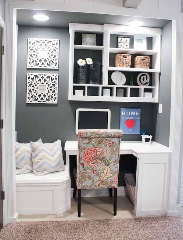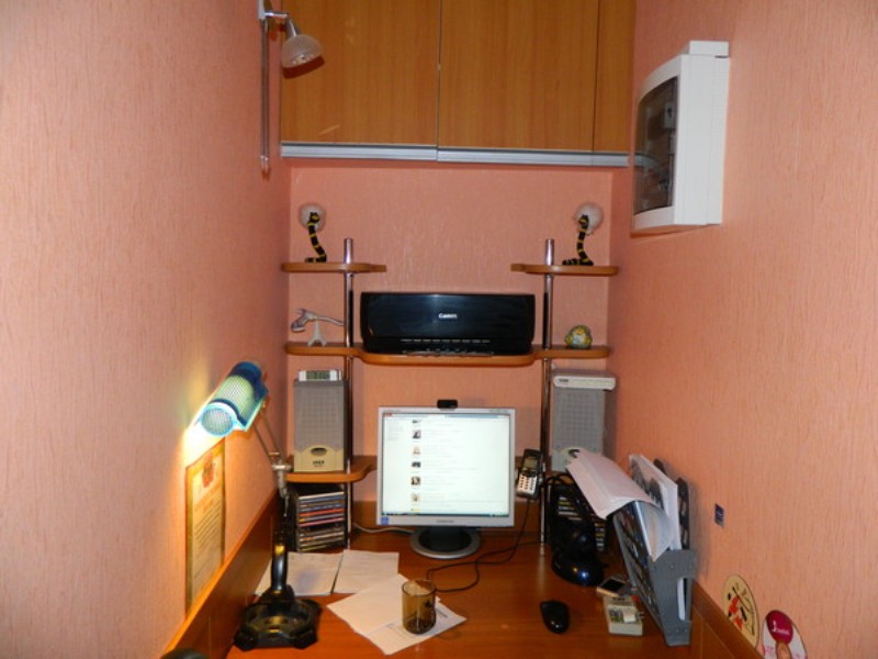Cette idée doit être prise lorsque la superficie est supérieure à 3 m², car l'armoire implique beaucoup de temps pour qu'une personne travaille dans un espace clos. Cela signifie qu'il devrait y avoir au moins plus d'espace que dans une armoire ou un compartiment de cuisine. Idéalement, vous devriez obtenir une salle complète avec un bureau, une chaise, des étagères et des étagères.
