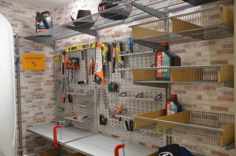 Les étagères peuvent être continues, avec perforation, raidisseurs, côtés; pour plus de commodité, ils doivent être dilués avec des tiroirs, des filets, des paniers, des crochets.