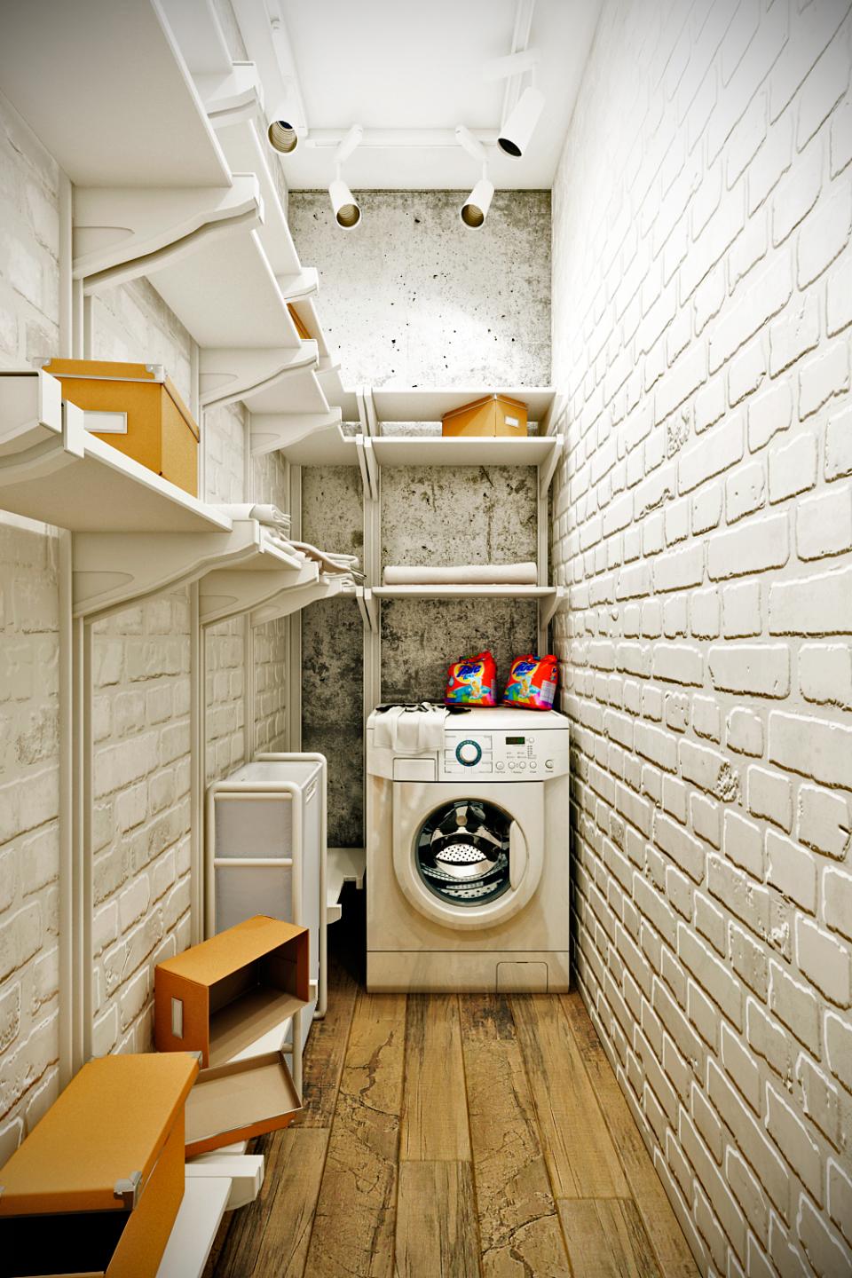 Souvent, les pièces de service sont situées en ligne avec la salle de bain et la salle de bain, miniatures et extrêmement incohérentes. Ici, l'option de créer une buanderie se suggère, où vous pouvez sortir à la fois la machine à laver et toutes les petites choses qui accompagnent le lavage, y compris les détergents et les produits d'hygiène, les seaux, les vadrouilles.
