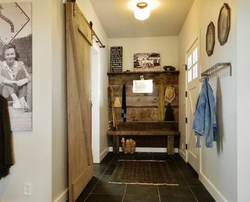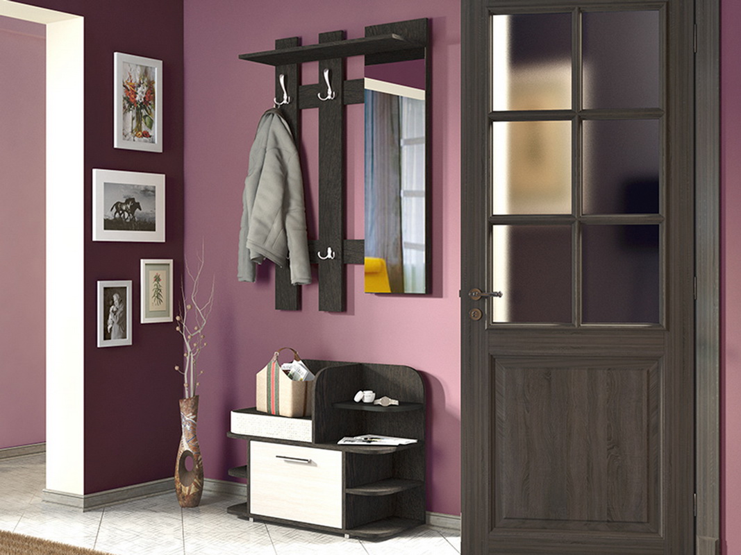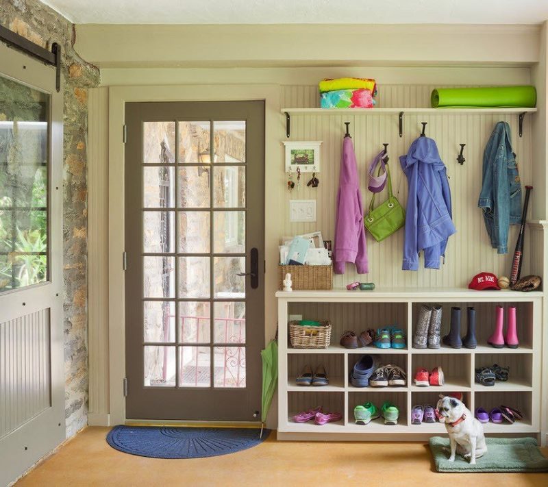 Le petit couloir devrait contenir tous les vêtements d'extérieur, ainsi que les chaussures des résidents. Pour ce faire, la salle est équipée d'un mobilier spécial, qui ne prend pas beaucoup de place. Des crochets de vêtements d'extérieur accrochés au hasard aideront à économiser de l'espace supplémentaire, au lieu d'une armoire encombrante. Des étagères ouvertes pour chaussures, accessoires et autres ustensiles conviennent à la place d'une armoire à chaussures. Vous pouvez également combiner le coin pour mettre des chaussures avec un endroit pour le ranger.