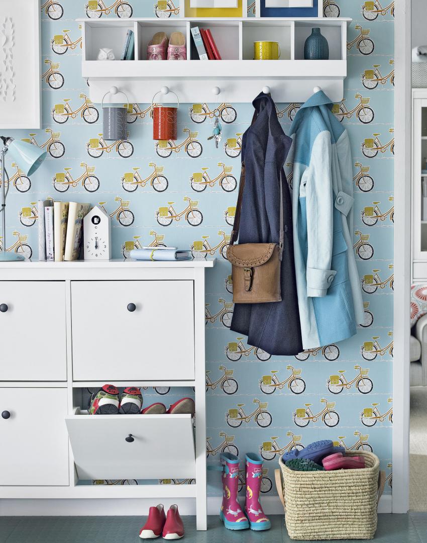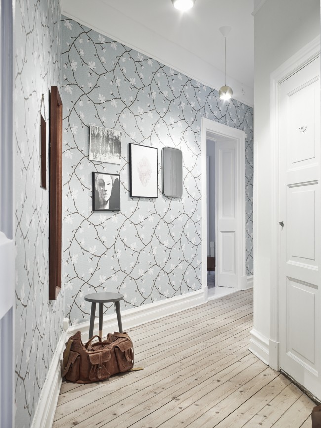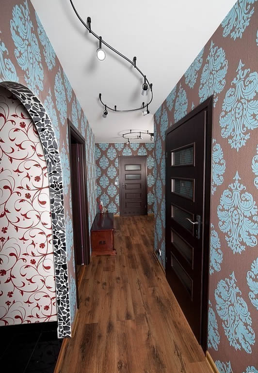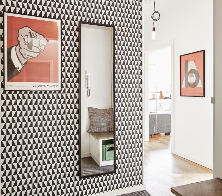 Le papier peint avec un motif actif convient pour un couloir avec des meubles simples et lumineux