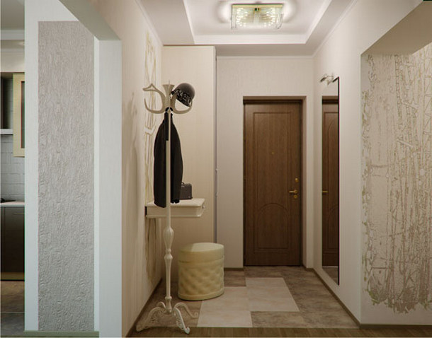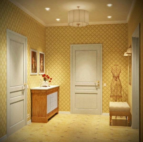 La meilleure solution est d'utiliser la Provence. Les meubles blanchis vieillis artificiellement ajouteront la chaleur requise au couloir. Le papier peint intissé avec des compositions florales poussant dans le sud de la France réchauffera chaque personne qui entre ici. Des couleurs douces ajouteront la chaleur nécessaire au couloir.