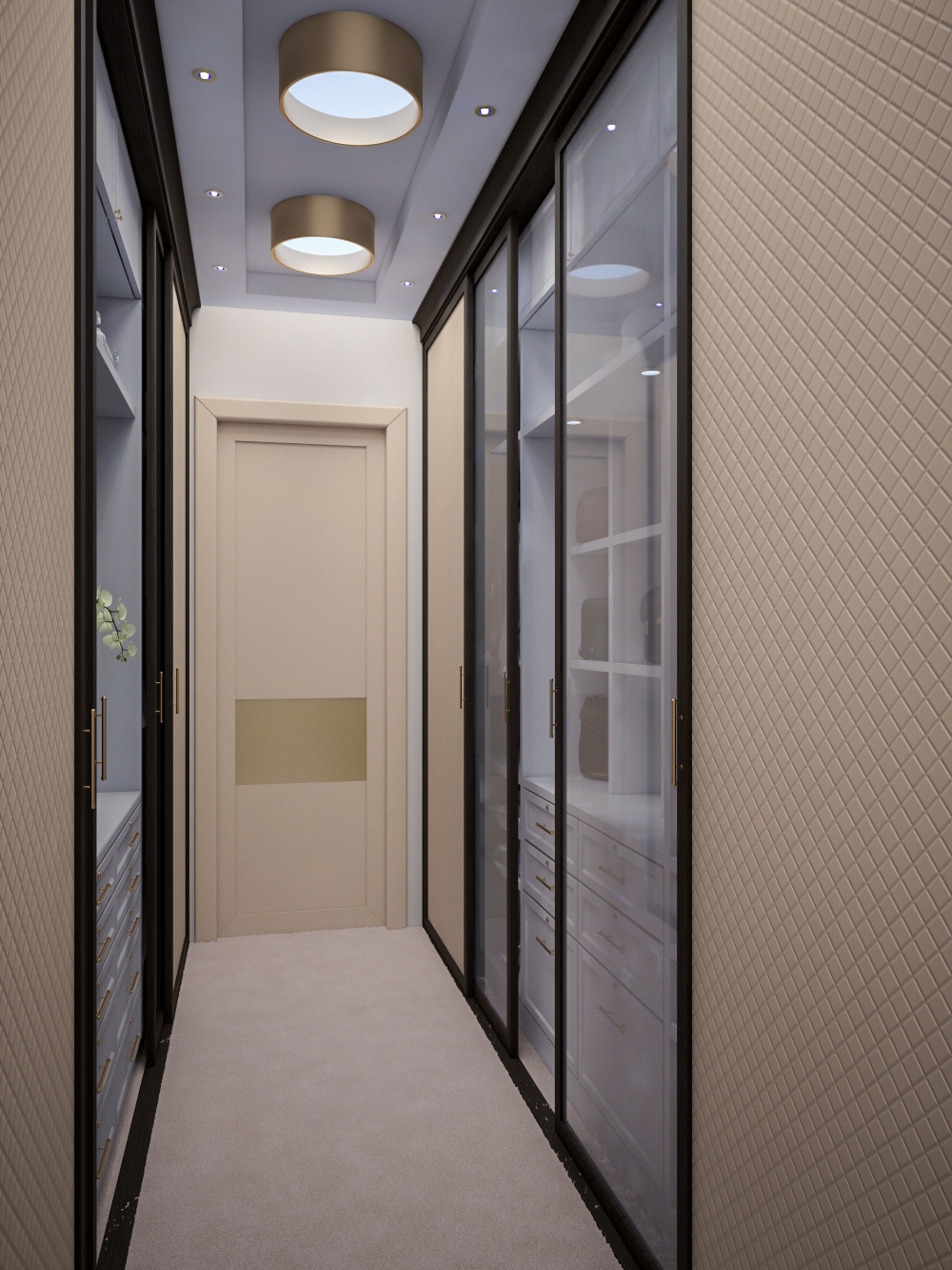 L'option d'intégrer une armoire dans tout le mur aveugle du couloir semble classique. L'armoire encastrée peut reproduire la forme du mur et couler en douceur dans la pièce suivante.