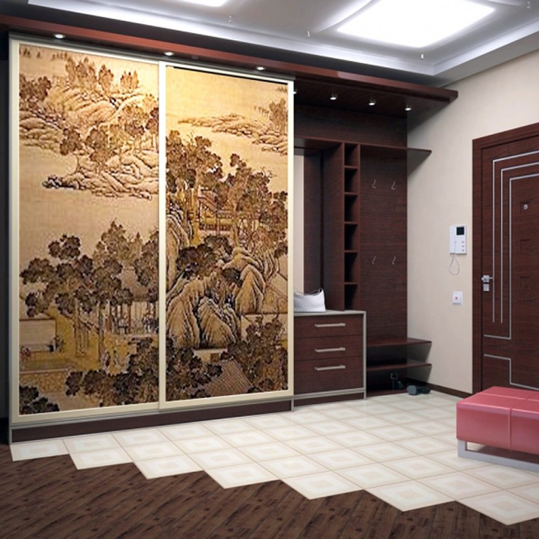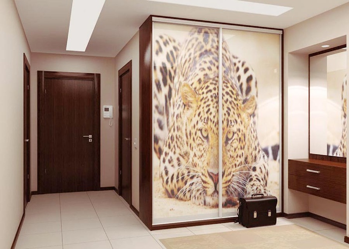 Lors de la décoration du hall d'entrée à l'aide d'une armoire coulissante, la décoration de la façade avec divers verres est spectaculaire: miroir, mat ou vitrail. Récemment, les modèles avec impression photo ont été très courants, remplaçant le papier peint photo familier. L'utilisation d'un éclairage intégré rend ce meuble aussi confortable que possible et vous permet également de l'utiliser comme lampe de nuit.