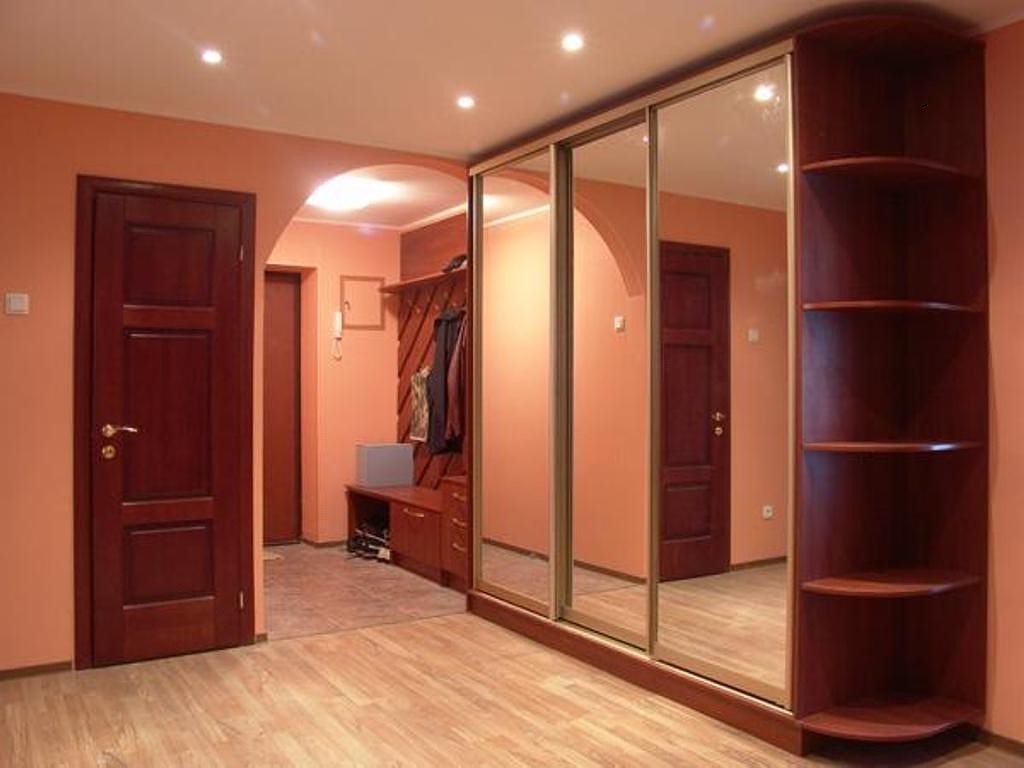 Il est pratique de placer une niche avec une commode, un banc ou un cintre entre les armoires encastrées. Pour les pièces spacieuses, les armoires encastrées en rayon, trapézoïdales ou d'angle conviennent. En combinaison avec l'éclairage situé à l'intérieur, ils ressemblent plus à de petits vestiaires confortables. Mais il convient de noter que ces structures occupent beaucoup d'espace et ne conviennent pas aux petites salles.