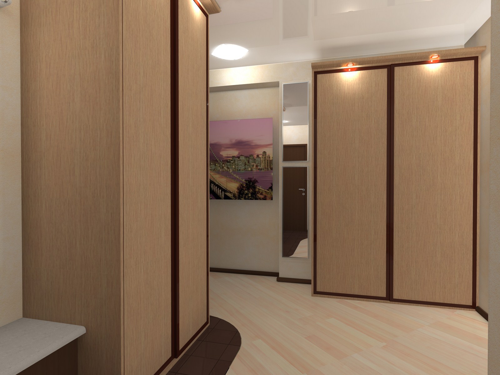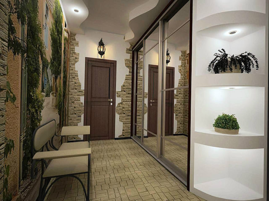 Il est souhaitable de diviser visuellement un long couloir en plusieurs zones. Les meubles avec éclairage et portes en miroir qui s'y trouvent ajouteront de la complexité et du volume à l'intérieur. N'installez pas de garde-robe en miroir au bout d'un long couloir, cela rendra la pièce très inconfortable et encore plus allongée, si nécessaire, il est préférable d'utiliser des façades en bois naturel dans ce cas.