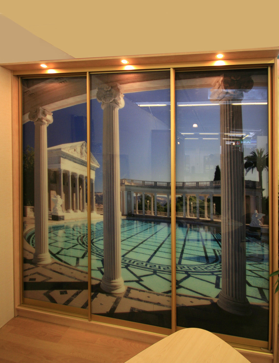 Le motif de sablage réalisé sur la surface miroir de la porte coulissante a un style inhabituel.