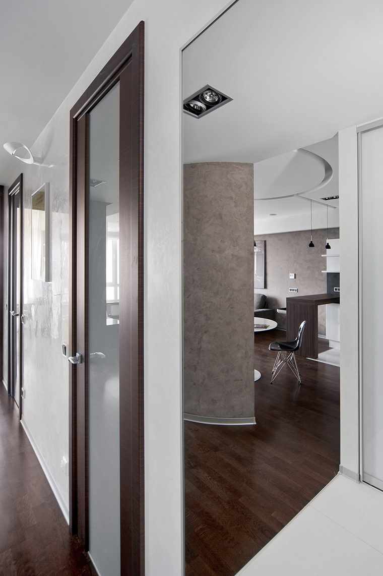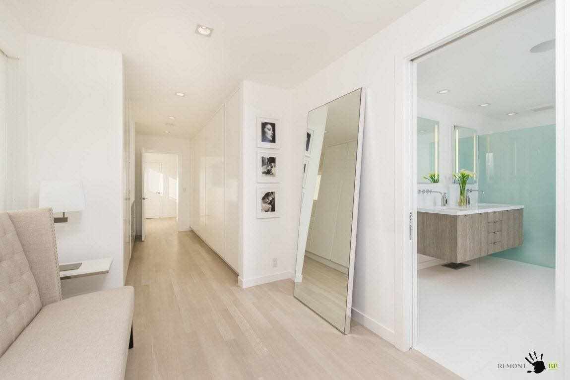 Mais vous ne devez pas imiter complètement les couleurs et les lignes strictes de la "Hi-tech" dans le couloir. Apportez une touche d'exclusivité et d'accentuation au style de couloir moderne. Combinez le blanc et le gris avec des couleurs vives et vibrantes. Concentrez-vous sur la porte coulissante de l'armoire avec un cadre de couleur rouge vif ou pêche et une forme ovale.Si vous prévoyez de faire une arche dans le salon ou qu'elle existe déjà, vous pouvez l'encadrer dans des couleurs vives. Accrochez des horloges murales ou des peintures décoratives en mettant l'accent sur elles (également des couleurs et des formes lumineuses et accrocheuses).