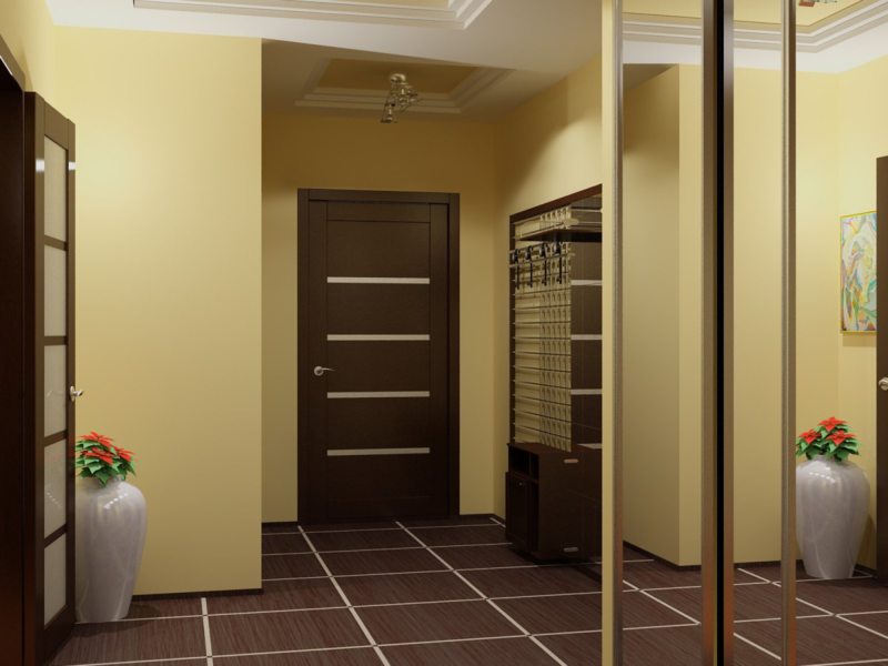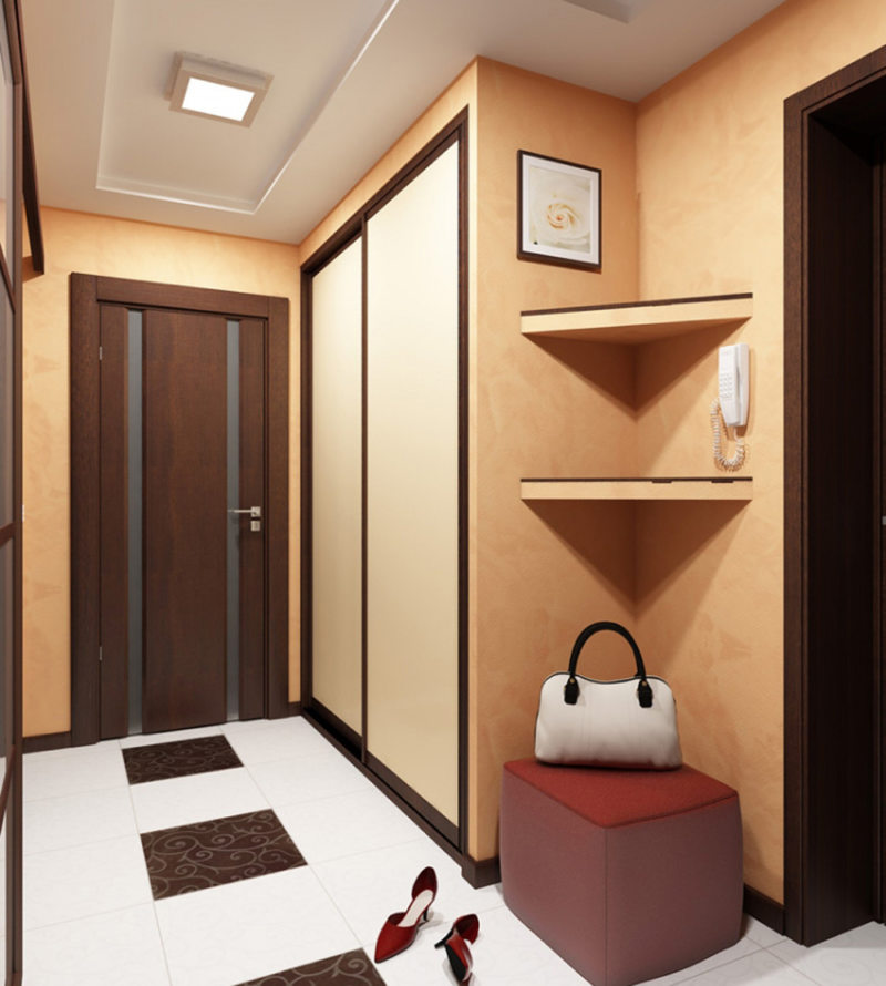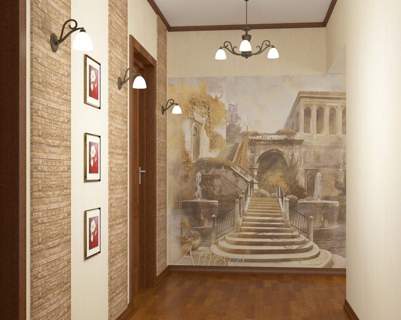 Afin de rendre le long couloir de l'appartement large et volumineux, il est important de choisir la bonne couleur et la bonne décoration murale.