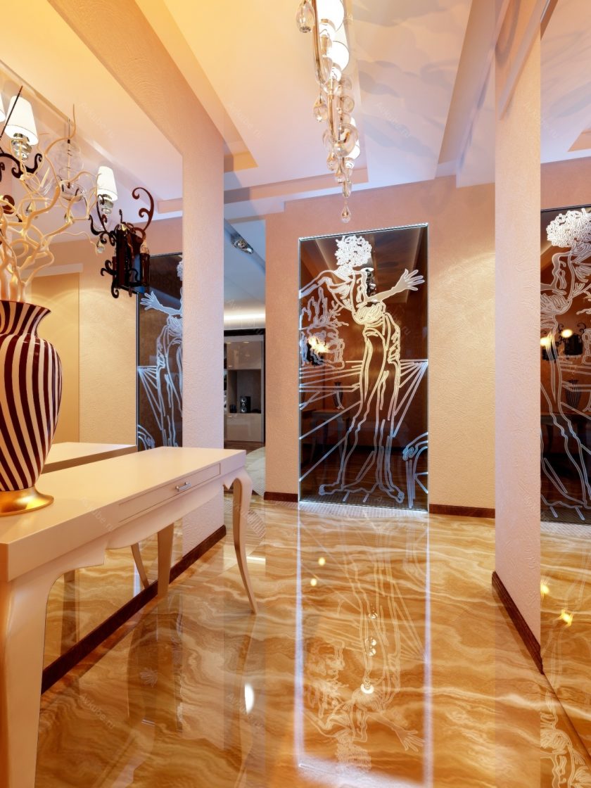 Dans un grand hall d'entrée, le sol peut être le même que dans le salon et les autres pièces de l'appartement. Pour les petits carreaux de céramique, même convient, car il peut devenir un moyen visuel de zonage, séparant le couloir des autres pièces.
