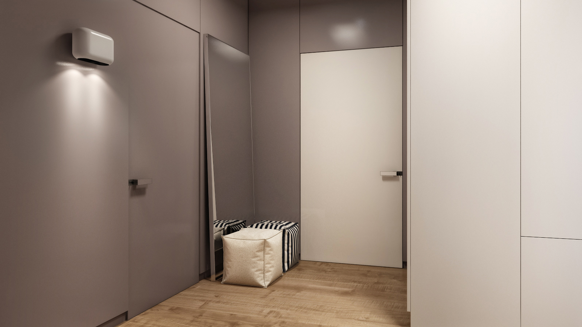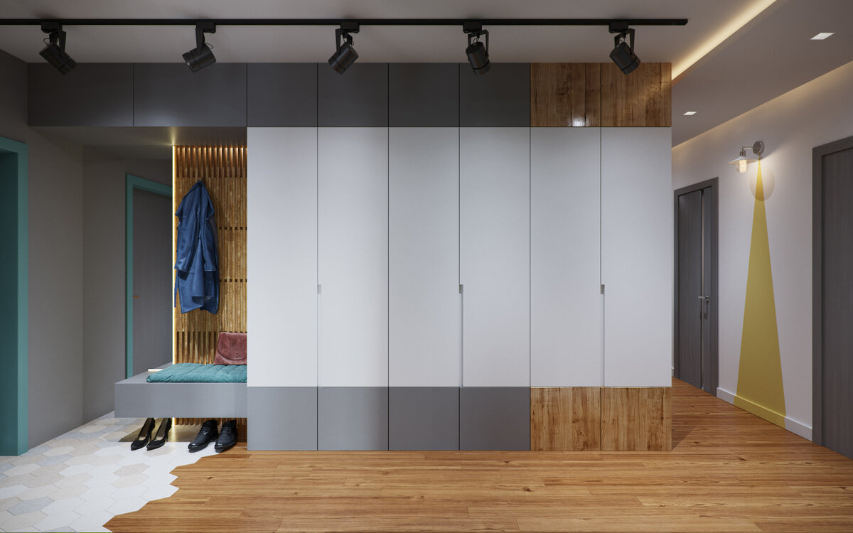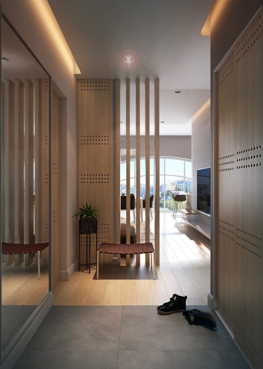Un grand couloir est un luxe, car dans les appartements typiques, sa fonction est souvent remplie par un petit couloir d'entrée. Dans une grande pièce, il y a plus d'options de conception, par exemple, vous pouvez installer une armoire coulissante pour correspondre à la décoration intérieure et un miroir pleine longueur. Il s'agit d'un ensemble minimal qui s'intègre parfaitement dans le concept de style. Si vous ajoutez un pouf et un étagère à chaussures contrastants, la pièce adoptera un look encore plus moderne.