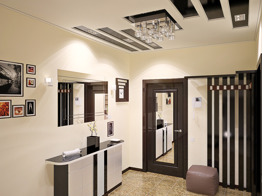 - Le meilleur choix pour le plafond sera la structure tendue. Ça va durer longtemps, ça a l'air assez cher. Pour les petites pièces, choisissez des plafonds brillants. Ils augmenteront visuellement la hauteur du couloir.