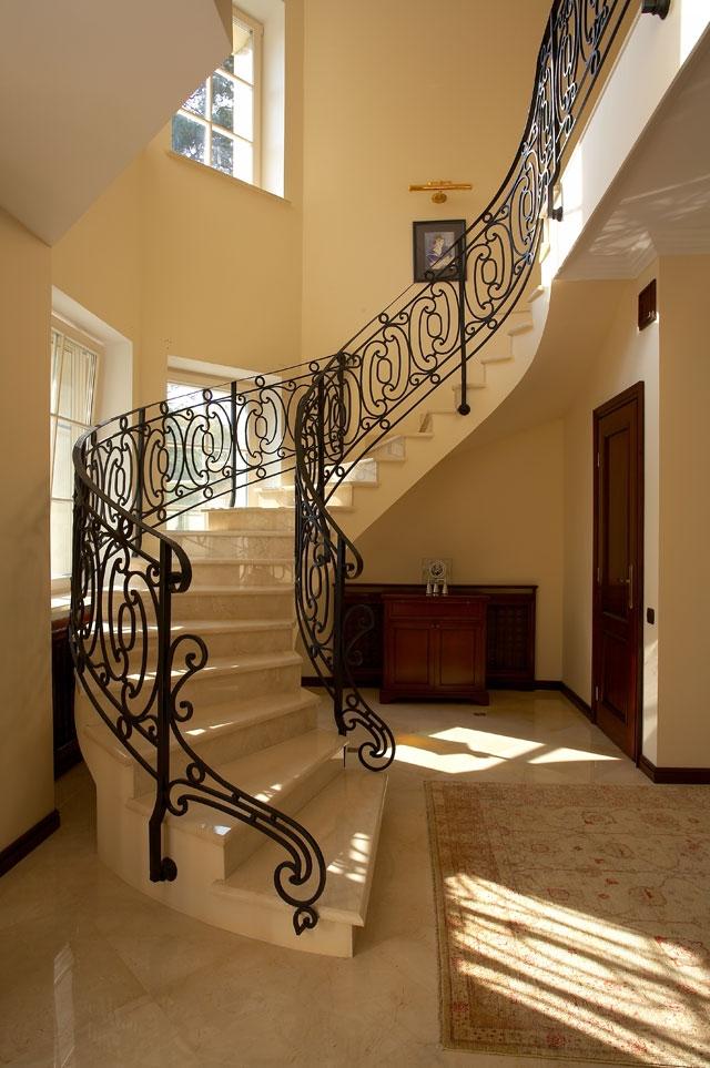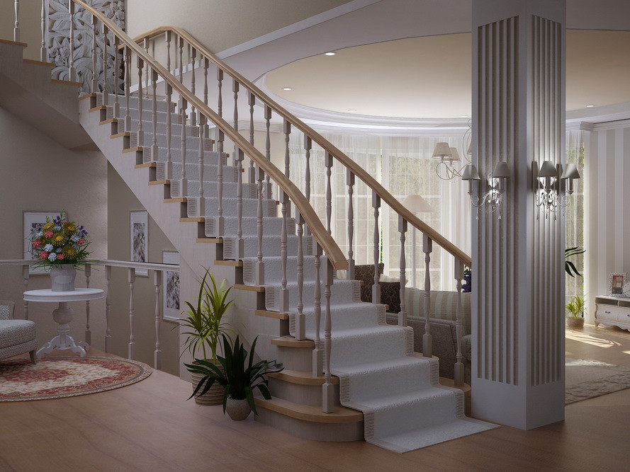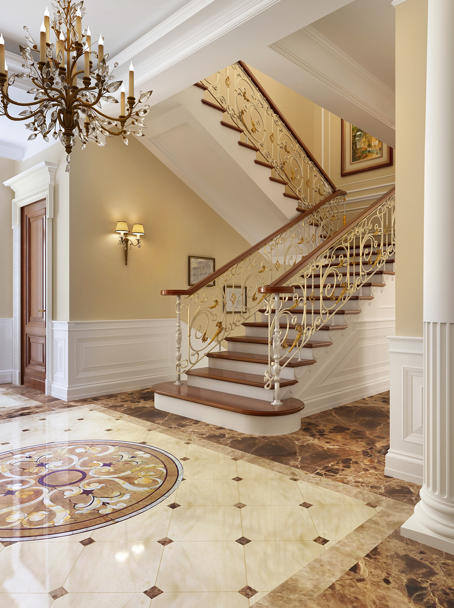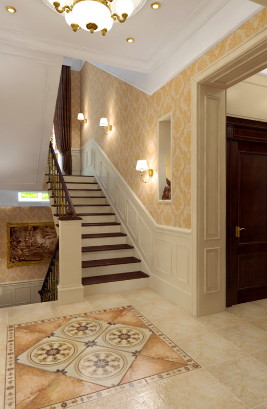 Au sol dans le hall, il est préférable de poser des carreaux, des carreaux de marbre.Ces matériaux sont assez stables, ont un aspect cher. La zone près de la porte d'entrée peut être décorée de grandes plantes arbustives en pots, d'un tapis. Non loin de la porte doit être placé un cintre pratique, un porte-clés, un support pour les parapluies. La zone près des escaliers peut également être décorée de plantes vivantes, de statues inhabituelles. L'escalier lui-même jouera un rôle énorme. Plus précisément - son style. Il doit être en harmonie avec le style du lobby.