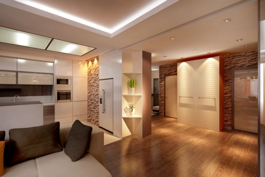 - Déficit de lumière. Dans de telles pièces ont rarement des fenêtres. La lumière naturelle n'obtient pratiquement pas. Tout cela nécessite l'équipement d'un système d'éclairage compétent. Le couloir est éclairé par endroits, utilisez des projecteurs.