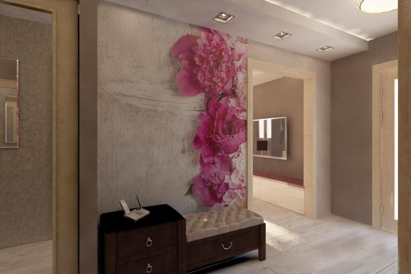 Si la version du papier peint classique semble inintéressante ou obsolète et que vous voulez quelque chose de plus original, vous pouvez donner la préférence au papier peint photo. Nous avons déjà parlé des caractéristiques de leur sélection pour l'intérieur d'une grande salle de bain, mais maintenant nous allons répéter un peu. Leur utilisation dans le couloir n'est pas rare. Ils sont faciles à installer et ont un design intéressant. Selon l'intrigue, le choix se porte généralement sur des fleurs ou des images naturelles.