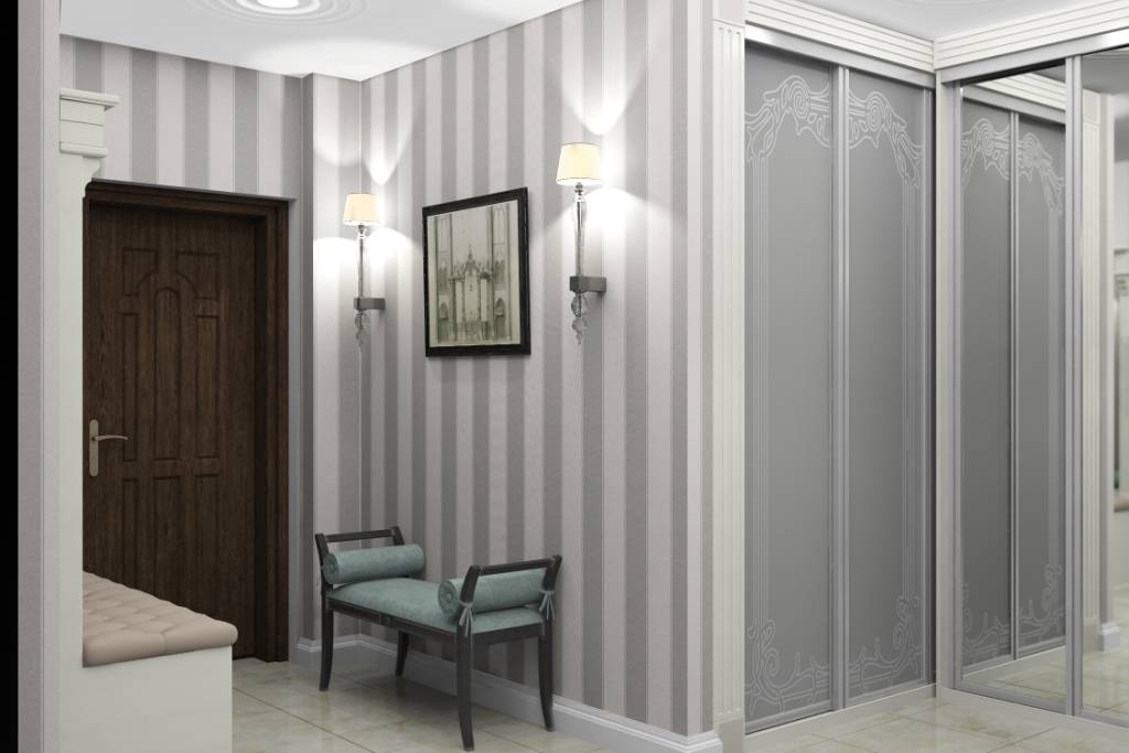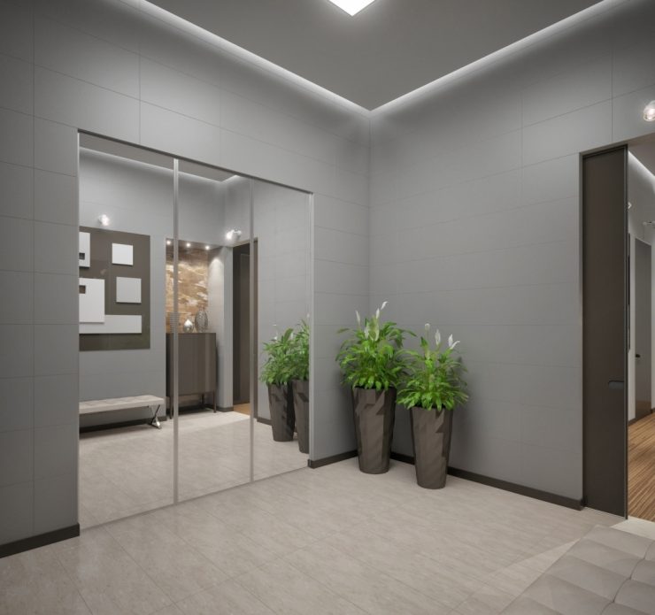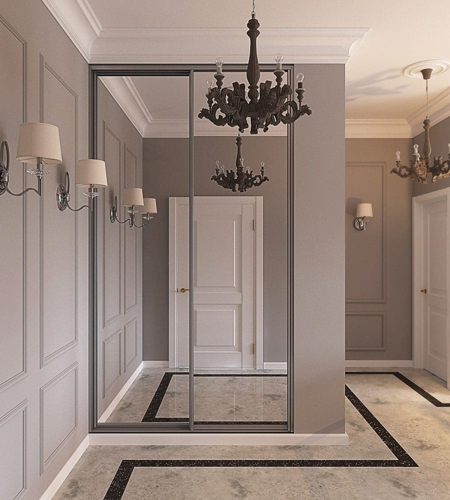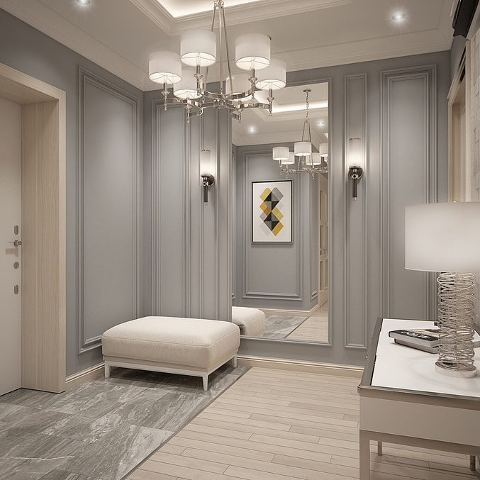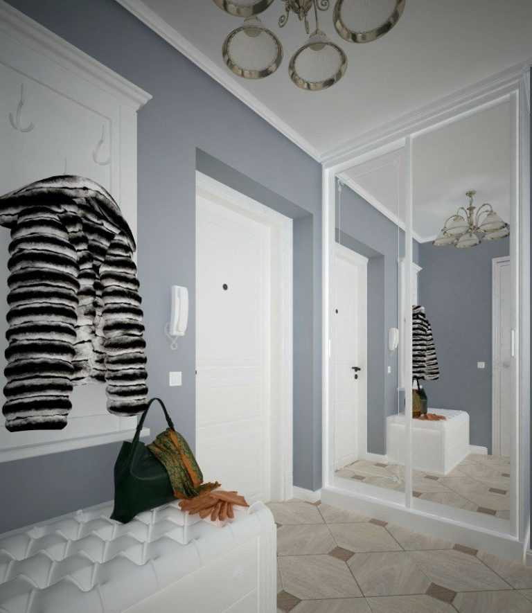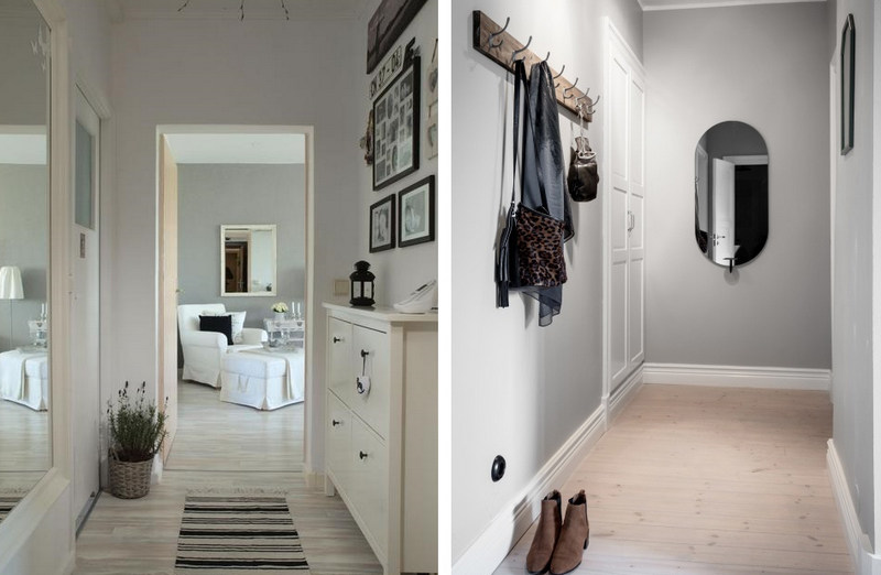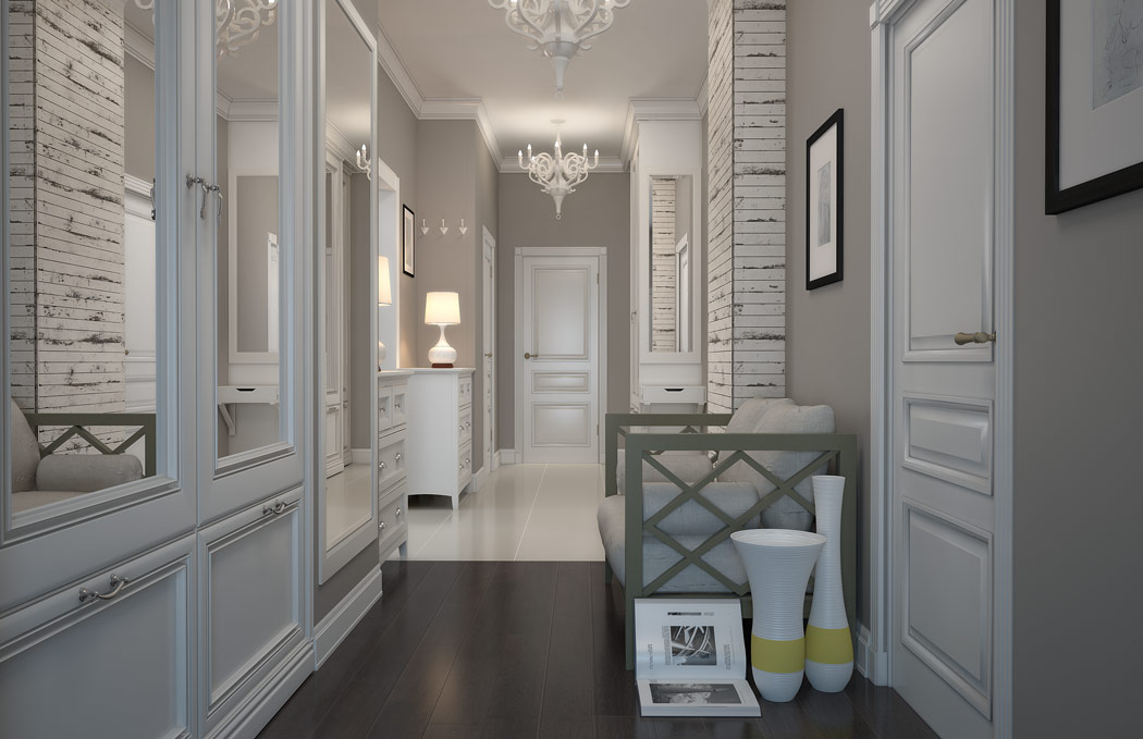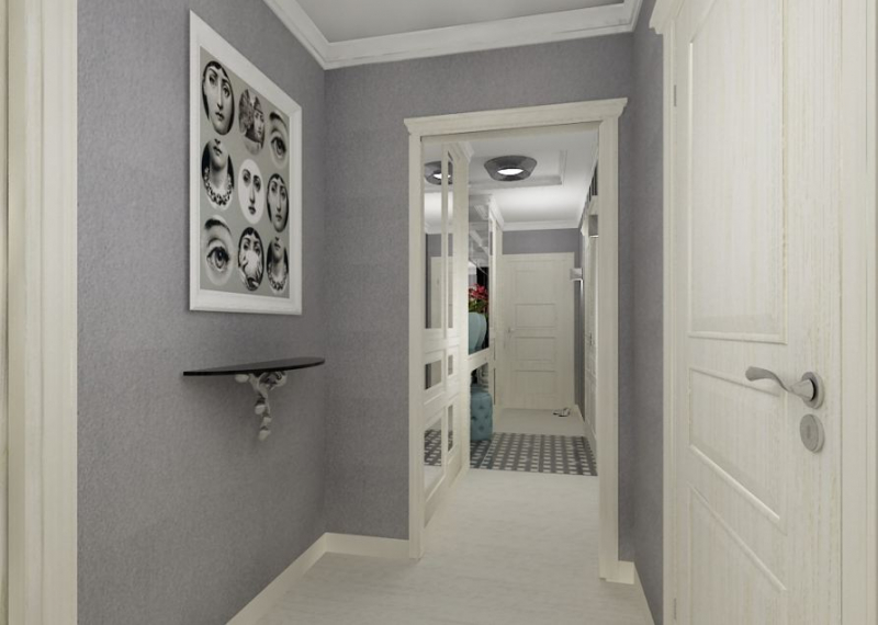 L'option classique pour le couloir est la quantité minimale de meubles, beaucoup d'éclairage et d'espace libre. Mais le plus souvent, il y a des biens immobiliers avec des couloirs étroits et petits. La teinte grise agrandit visuellement une petite pièce, surtout si elle est complétée par des surfaces en miroir.