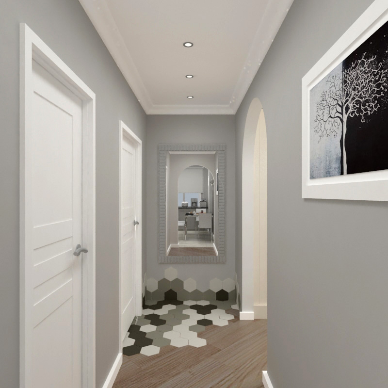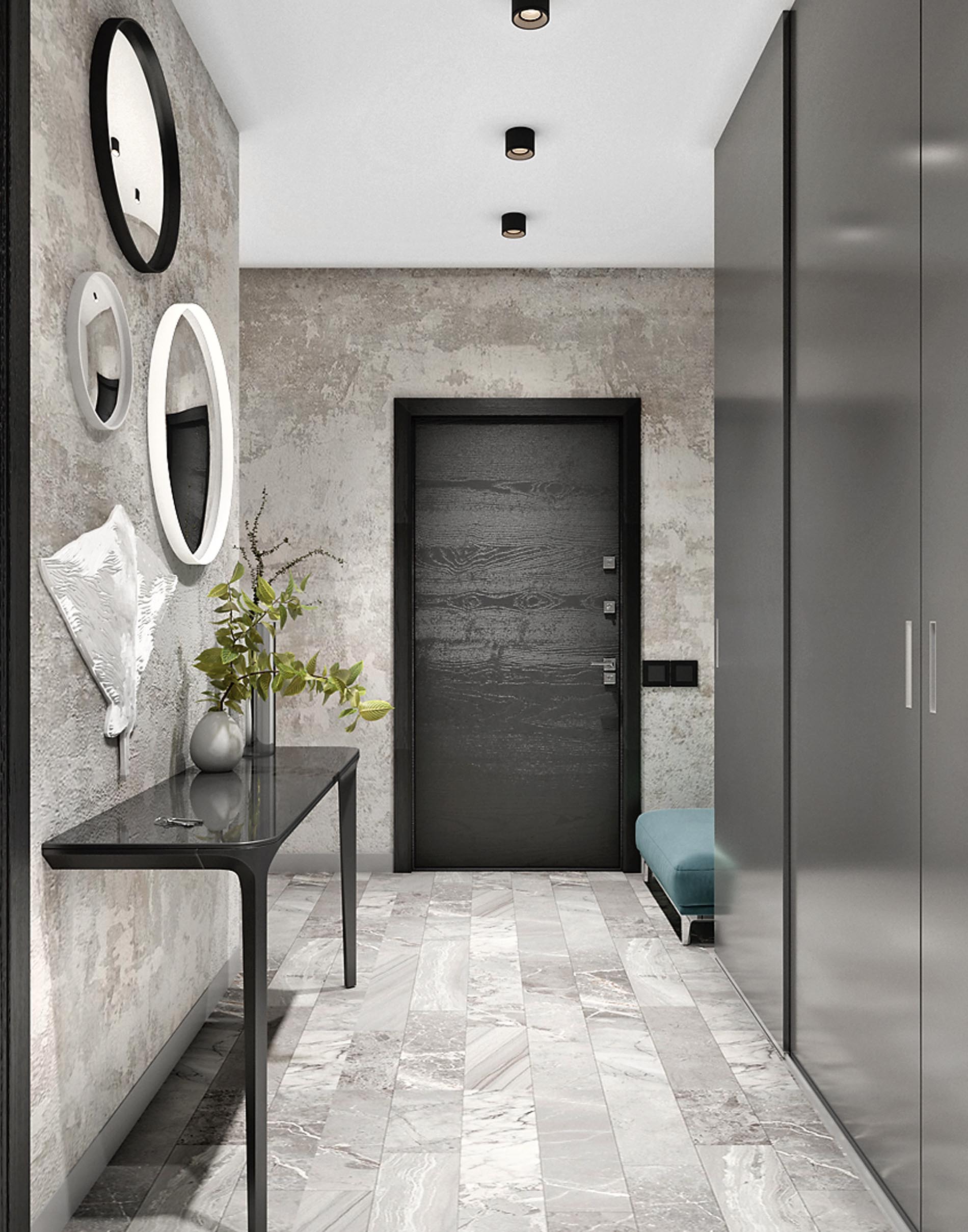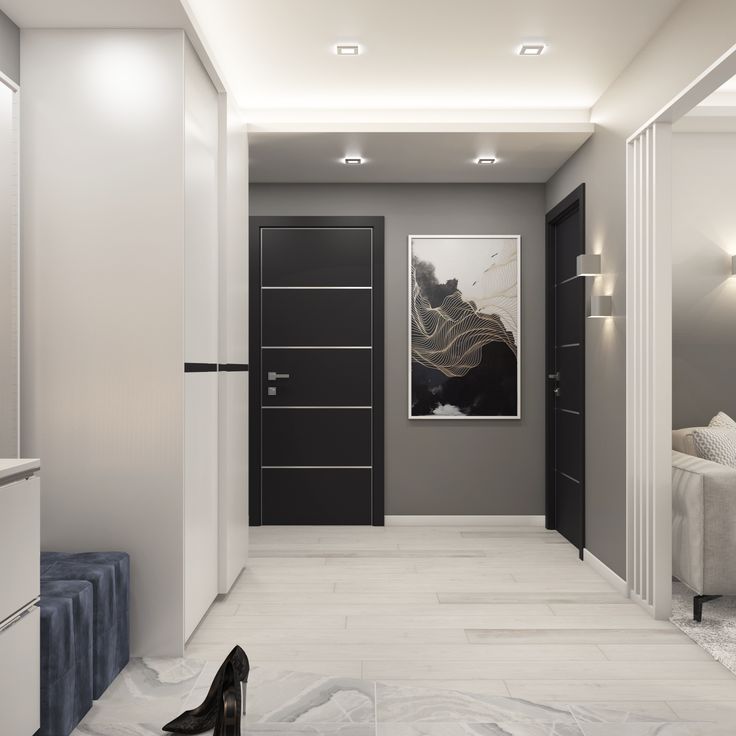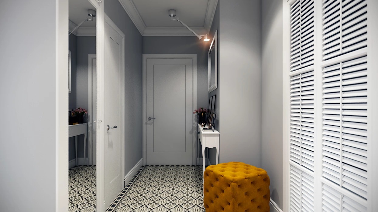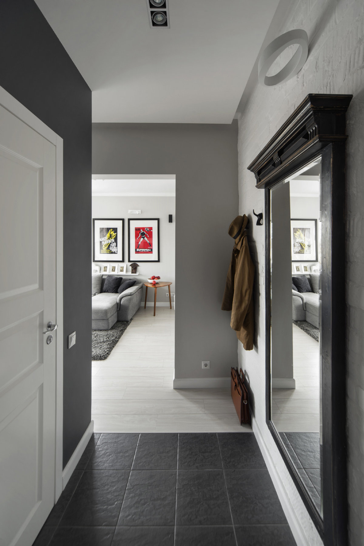 Le couloir gris peut provoquer différentes émotions, par exemple, la joie de rentrer chez soi ou, à l'inverse, l'envie de quitter cette chambre prim et froide au plus vite. Les amateurs de compositions géométriques apprécieront le hall d'entrée aux couleurs grises.