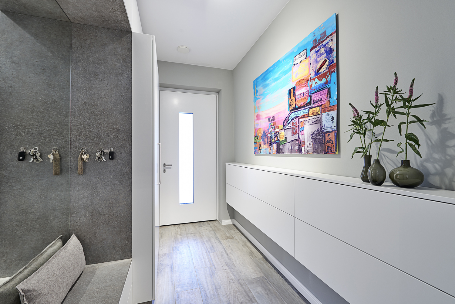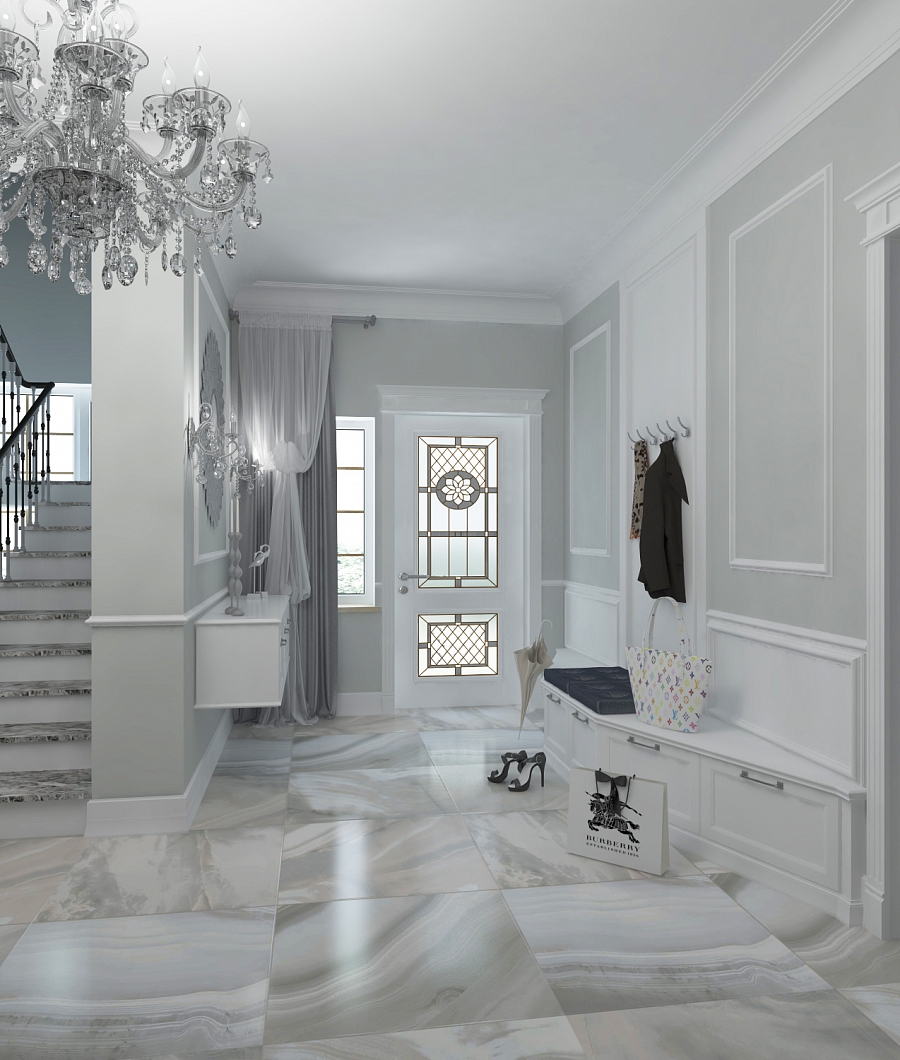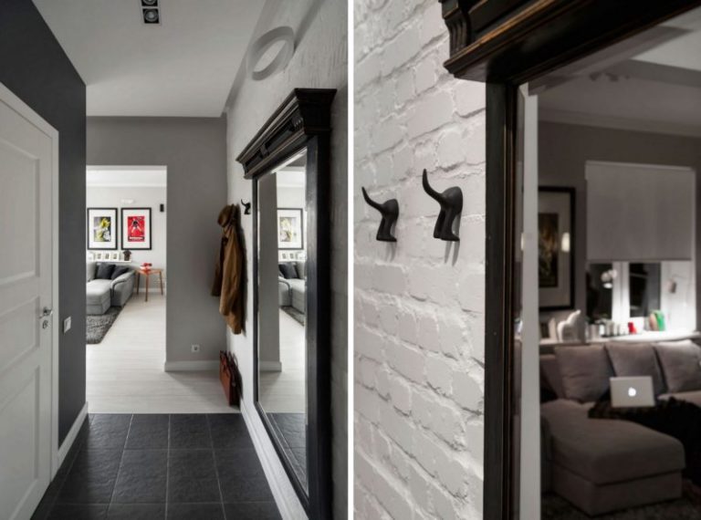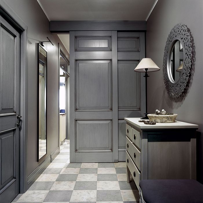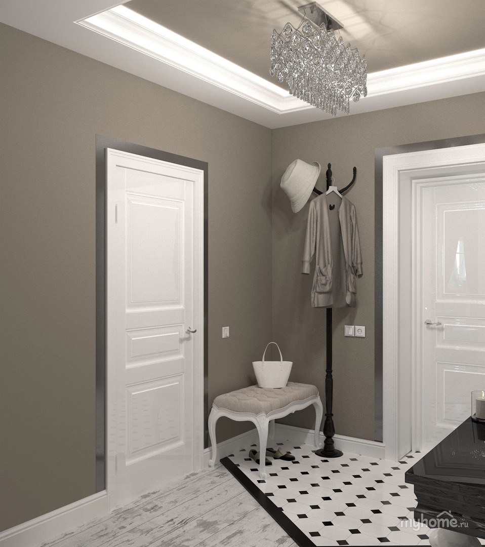 Le couloir gris peut provoquer différentes émotions, par exemple, la joie de rentrer chez soi ou, à l'inverse, l'envie de quitter cette chambre prim et froide au plus vite. Les amateurs de compositions géométriques apprécieront le hall d'entrée aux couleurs grises.