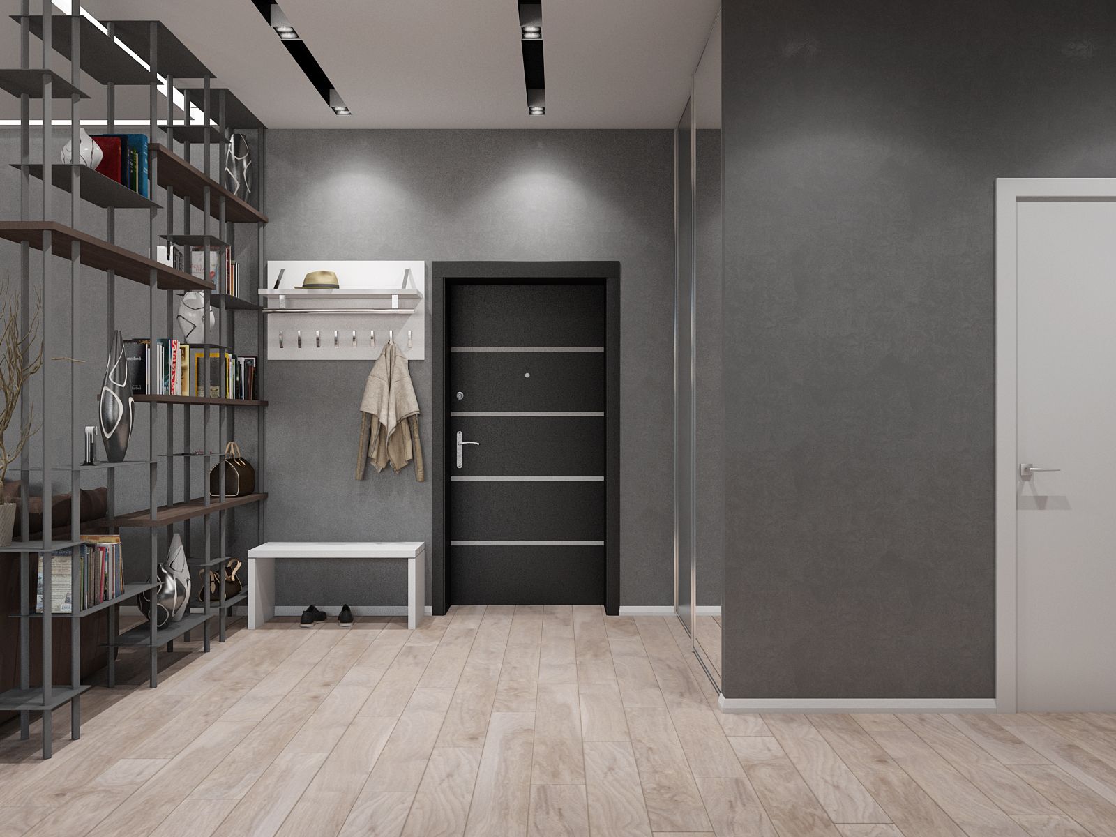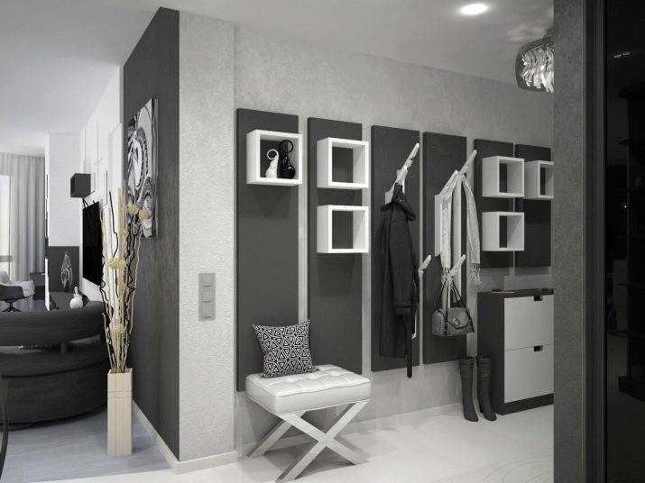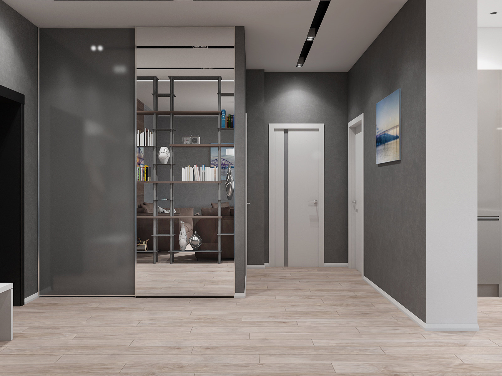 Le couloir élégant au design gris séduira les adeptes des formes géométriques correctes et de l'utilisation rationnelle de chaque centimètre.