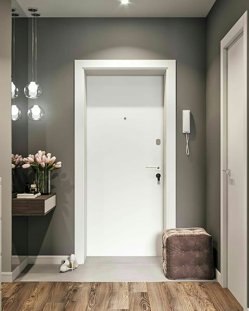 La conception du couloir aux portes grises n'est pas qu'une seule teinte sur toutes les surfaces et tous les meubles. Les concepteurs modernes utilisent une combinaison de couleurs grises avec d'autres couleurs, par exemple le blanc et plusieurs tons de la couleur principale.