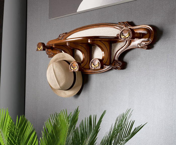 L'étagère sur le dessus pour les foulards, les chapeaux, les chapeaux est particulièrement vraie en hiver et pour ceux qui aiment porter un chapeau. Si vous suspendez un chapeau, il peut perdre sa forme. Les fabricants proposent diverses options - en bois, forgé et autres.