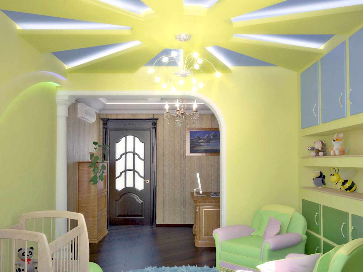 A escolha das matérias-primas para acabamento do quarto das crianças deve ser principalmente natural - papel de parede não tecido ou papel, parquet envernizado ou linóleo natural; o teto deve ser tratado simplesmente com um primer anti-séptico.
