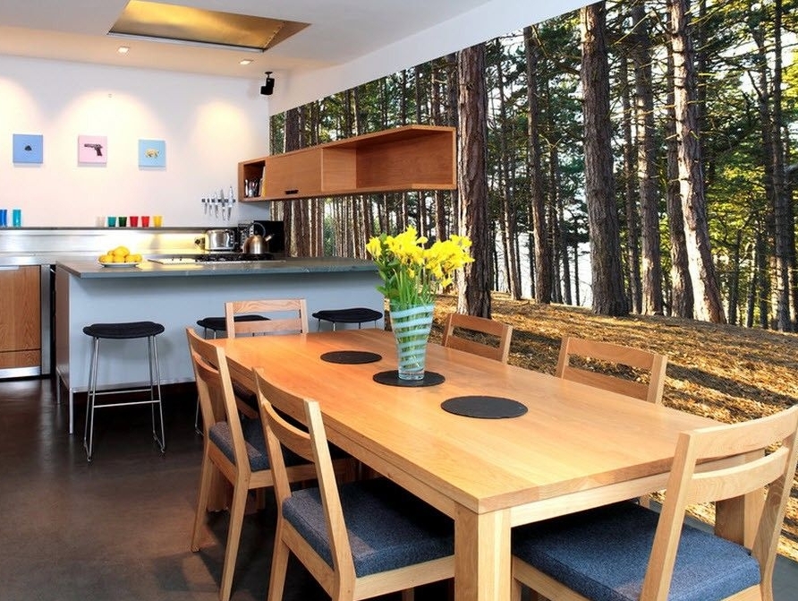 Para um interior ecológico, você pode escolher um padrão de floresta que complemente a mesa e as cadeiras feitas de madeira natural e não processada.