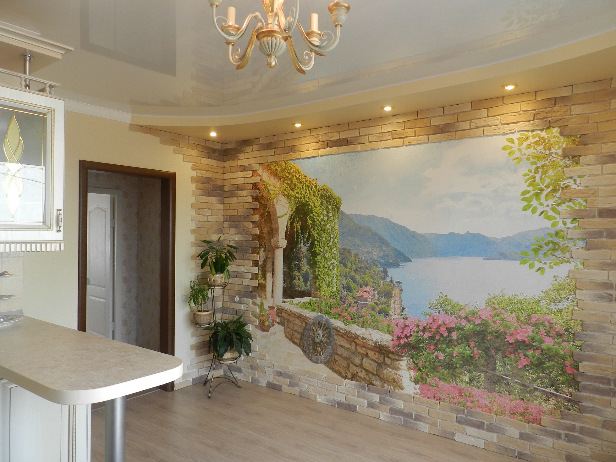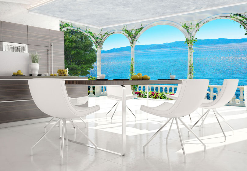 Uma pequena cozinha pode ser expandida com papéis de parede de paisagens com uma perspectiva de longa distância. Variantes de desenhos com estradas, caminhos, o mar, onde uma perspectiva que se apóia no horizonte, é claramente visível. Portanto, o espaço na imagem complementará o espaço da sala, que será reproduzido para aumentar a área da cozinha.