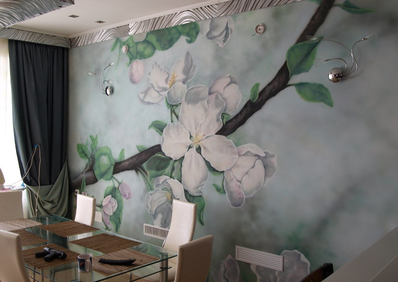 Na maioria das vezes, combinam paisagens e padrões, naturezas-mortas e imagens macro, pinturas de arte e ornamentos. Na prática, pode parecer uma paisagem de uma rua européia com pavimentos na parede e um papel de parede com uma imitação da textura da pedra na área do avental. Ou uma imagem macro brilhante de flores em uma das paredes e flores semelhantes menores em um avental.