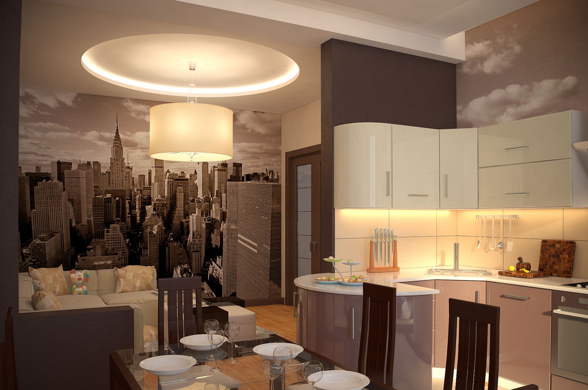 O design elegante tornará a sala não apenas moderna, mas também aconchegante, o que é importante para a cozinha, onde todas as famílias se reúnem todos os dias.