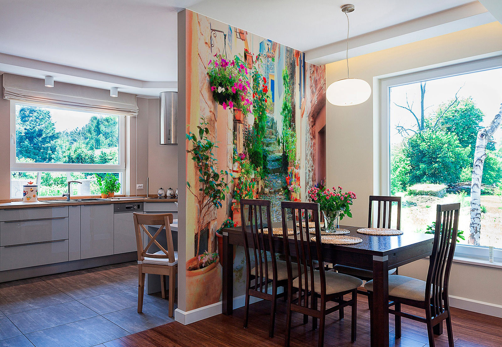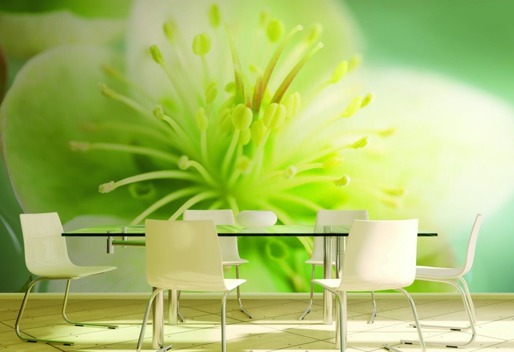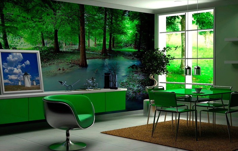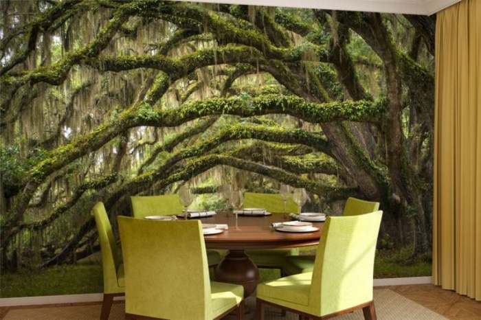 A área de jantar é frequentemente decorada com luxuosas coberturas fotográficas do gênero 3D. Uma variedade de opções de design é apropriada aqui. Por exemplo, o papel de parede pode estar em tom com cadeiras ou um conjunto de cadeiras e uma mesa, especialmente se elas forem de uma cor incomum - verde, laranja, amarelo.