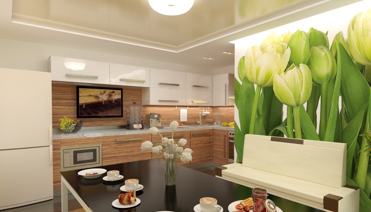 Cozinha ampla pode ser decorada com papel de parede em qualquer estilo. Aqui, paisagens por toda a parede, imagens macro de frutas, naturezas-mortas modernas e outras composições serão apropriadas; o principal é selecionar uma imagem para combinar com o mobiliário e a decoração e garantir que o tema corresponda ao estilo da sala.