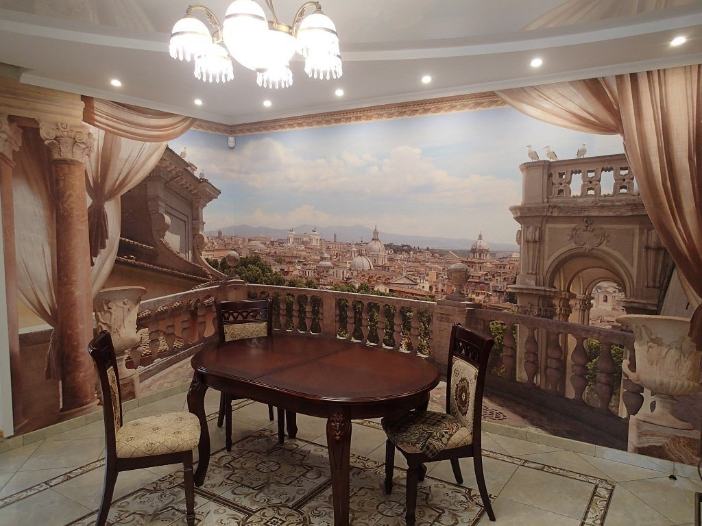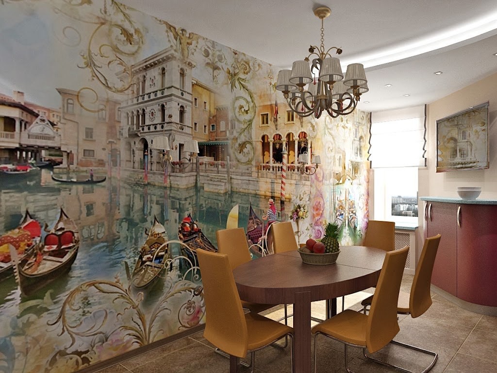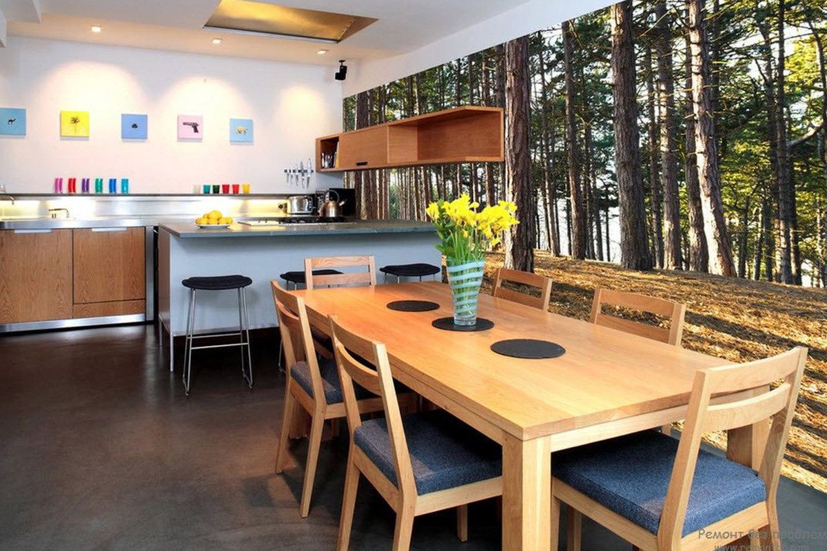 Os não tecidos são ideais para a cozinha, pois podem ser lavados. É fácil e simples colar opções em um rolo, porque você não precisa ajustar o padrão nas costuras. A panorâmica pode ser colada em toda a sala, se você não tiver medo do efeito 3D, multiplicado por quatro.