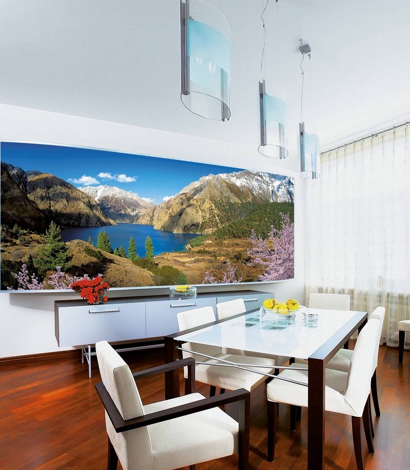 O enredo deve ser selecionado dependendo do estilo do interior. Uma boa idéia seria a imagem da natureza para um interior ecológico, cores para Provence e neoclassicismo, fotos macro elegantes para minimalismo e alta tecnologia, paisagens únicas em preto e branco da cidade para um loft.