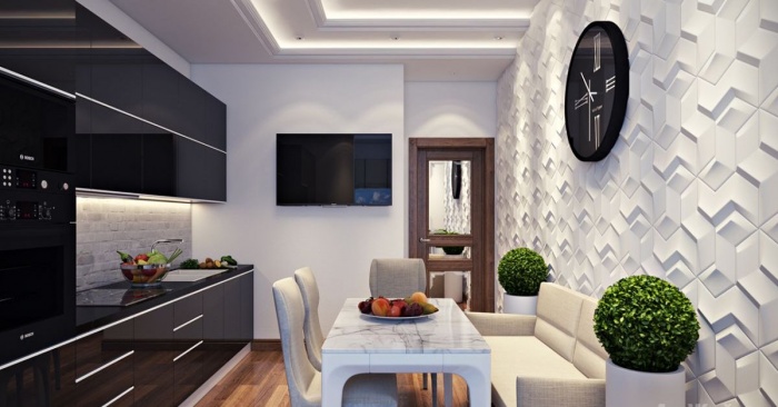 Hoje, há toda uma série de revestimentos tridimensionais para colocação em várias paredes da sala. Nesse caso, é criado um design de interiores único e holístico, com uma atmosfera incomum.