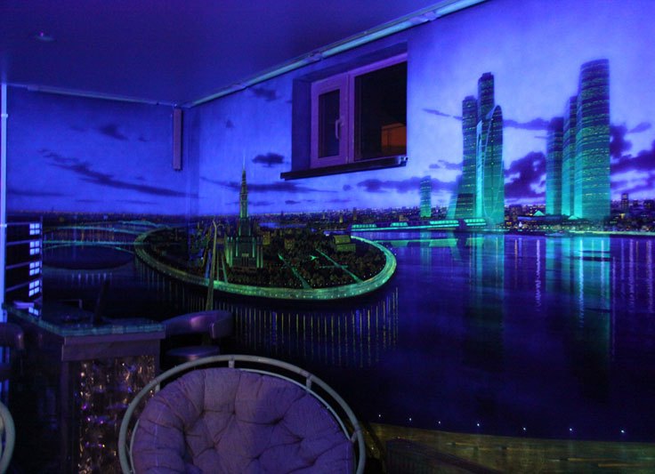 Uma das opções mais interessantes para os murais de fotos em 3D são os revestimentos fluorescentes que brilham no escuro. À tarde, esses revestimentos geralmente parecem, mas com o início da escuridão um belo padrão luminoso aparece em um fundo preto, o que criará uma atmosfera incrível na sala.