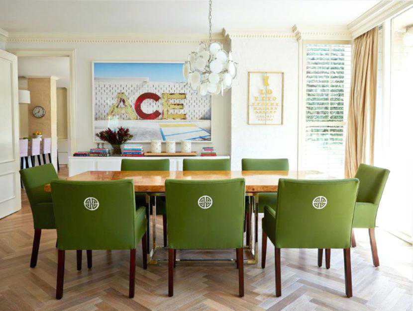 Uma combinação contrastante de cadeiras verdes e uma mesa lacada a preto