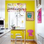 Na cozinha, uma pessoa gasta tempo suficiente, portanto a cor desta sala deve preenchê-la com força. Dinâmico, alegre e mais exigido pode ser chamado de tons de amarelo claro, branco e vermelho.