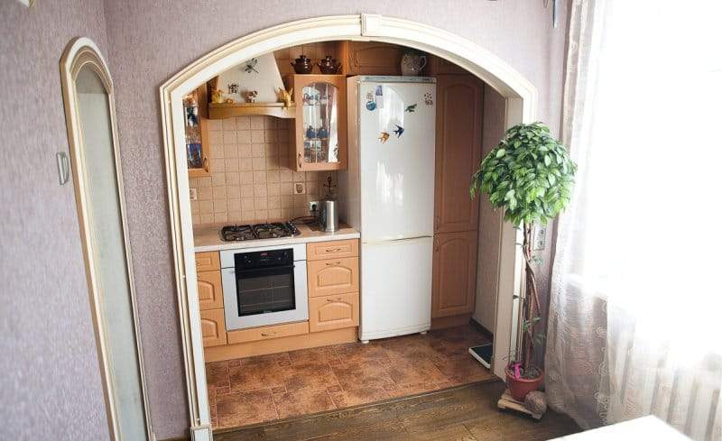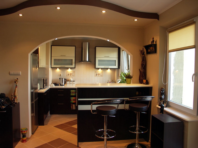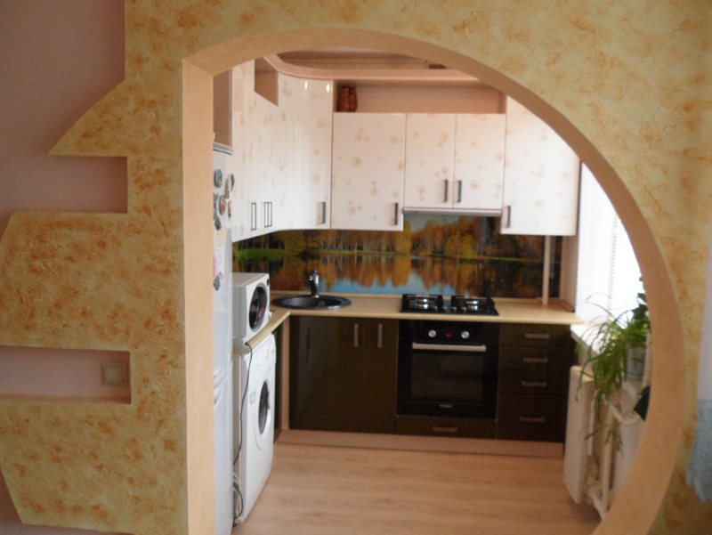 Quanto mais ampla a abertura, visualmente mais próxima estará a cozinha e a sala de estar. Uma abertura estreita também é possível. Isso delimitará perfeitamente o espaço de um pequeno apartamento. Esta é a solução mais simples e ideal para o espaço de zoneamento. Adicione iluminação extra para criar um efeito decorativo específico.