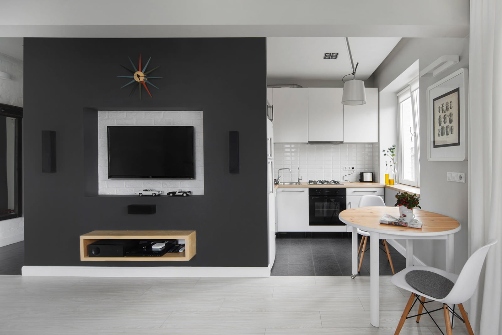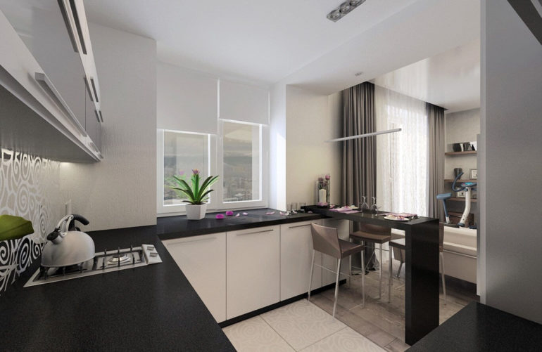 Onde a parede costumava estar, você pode instalar uma barra. Isso permite destacar visualmente o espaço, além de criar um local separado para comer. Não é necessário escolher um balcão longo. A duração do design depende das suas preferências individuais.