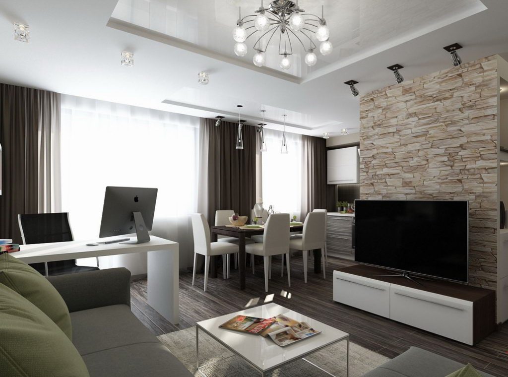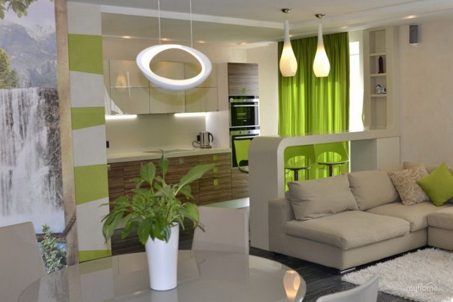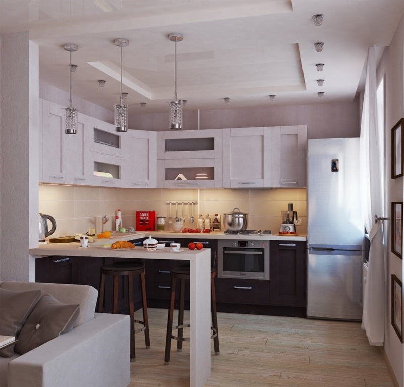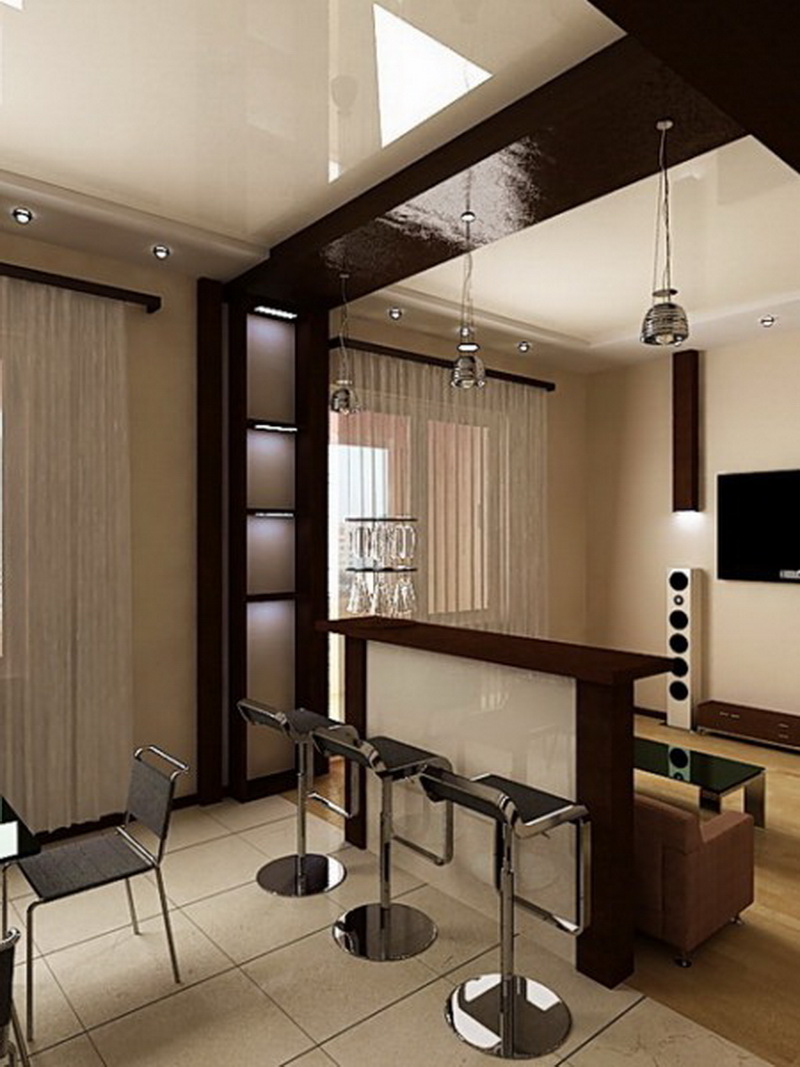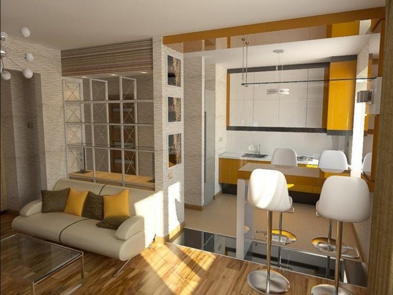 As possibilidades de reconstrução são praticamente ilimitadas. Designers modernos oferecem muitas soluções diferentes para todos os gostos. Você deve escolher o que gosta. Por exemplo, você pode trabalhar em um sistema de iluminação ou dividir o espaço por um balcão de barras. Considere as opções mais comuns.