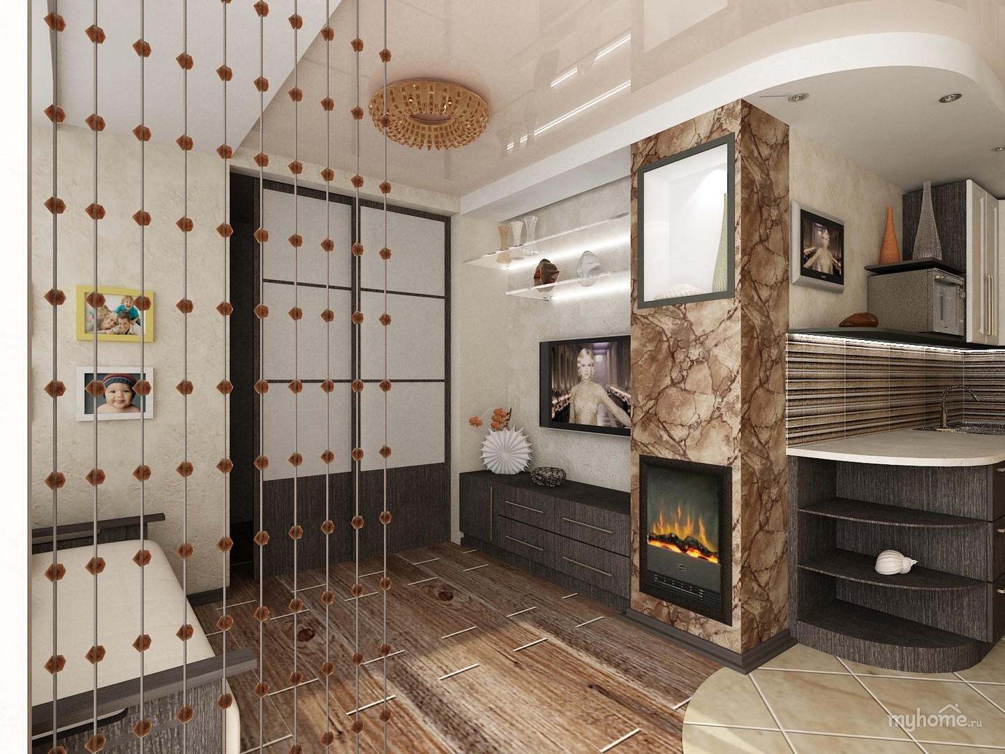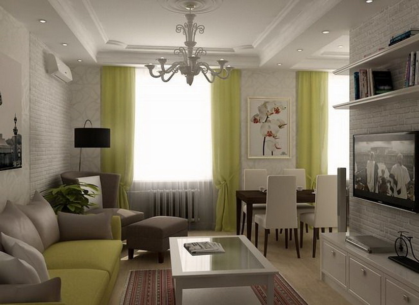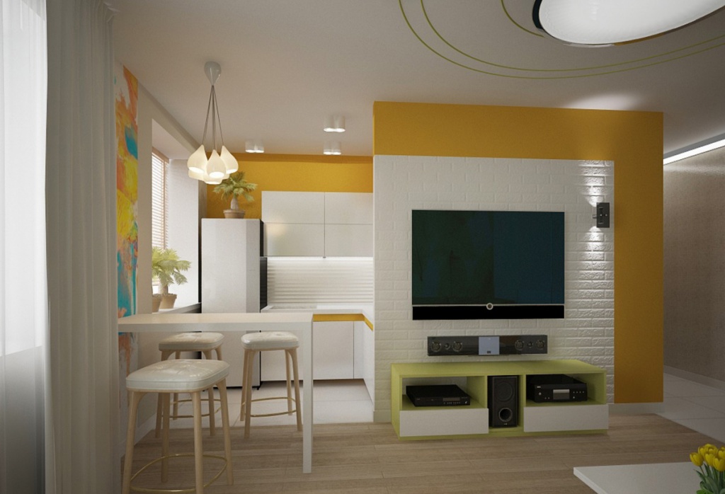 - Na sala, você pode colocar uma pequena mesa de café e um sofá aconchegante. Coloque um suporte de TV separado ou pendure-o na parede para economizar espaço.